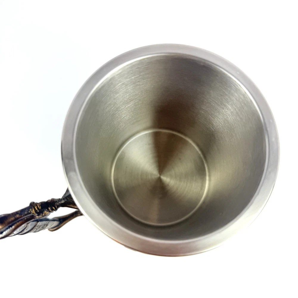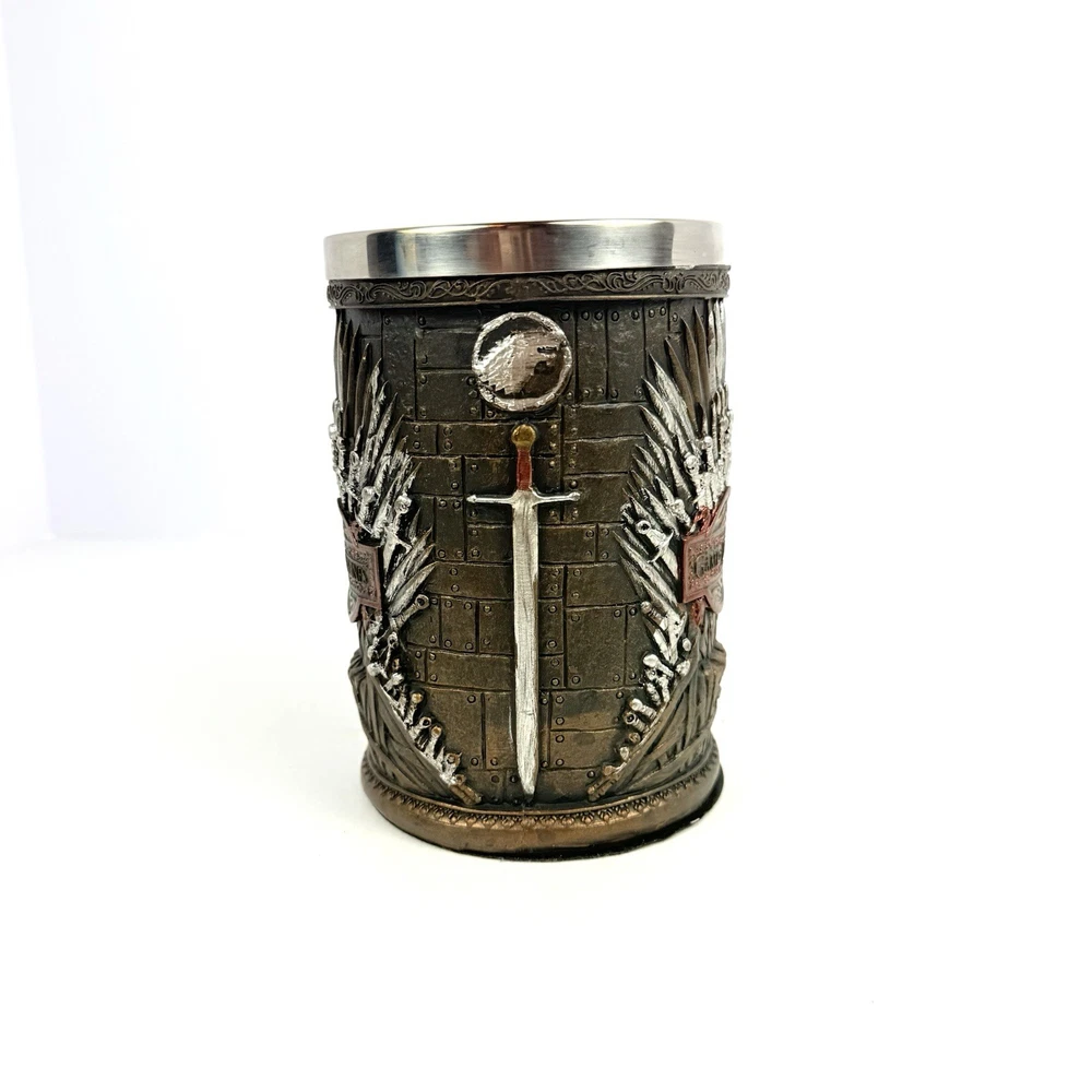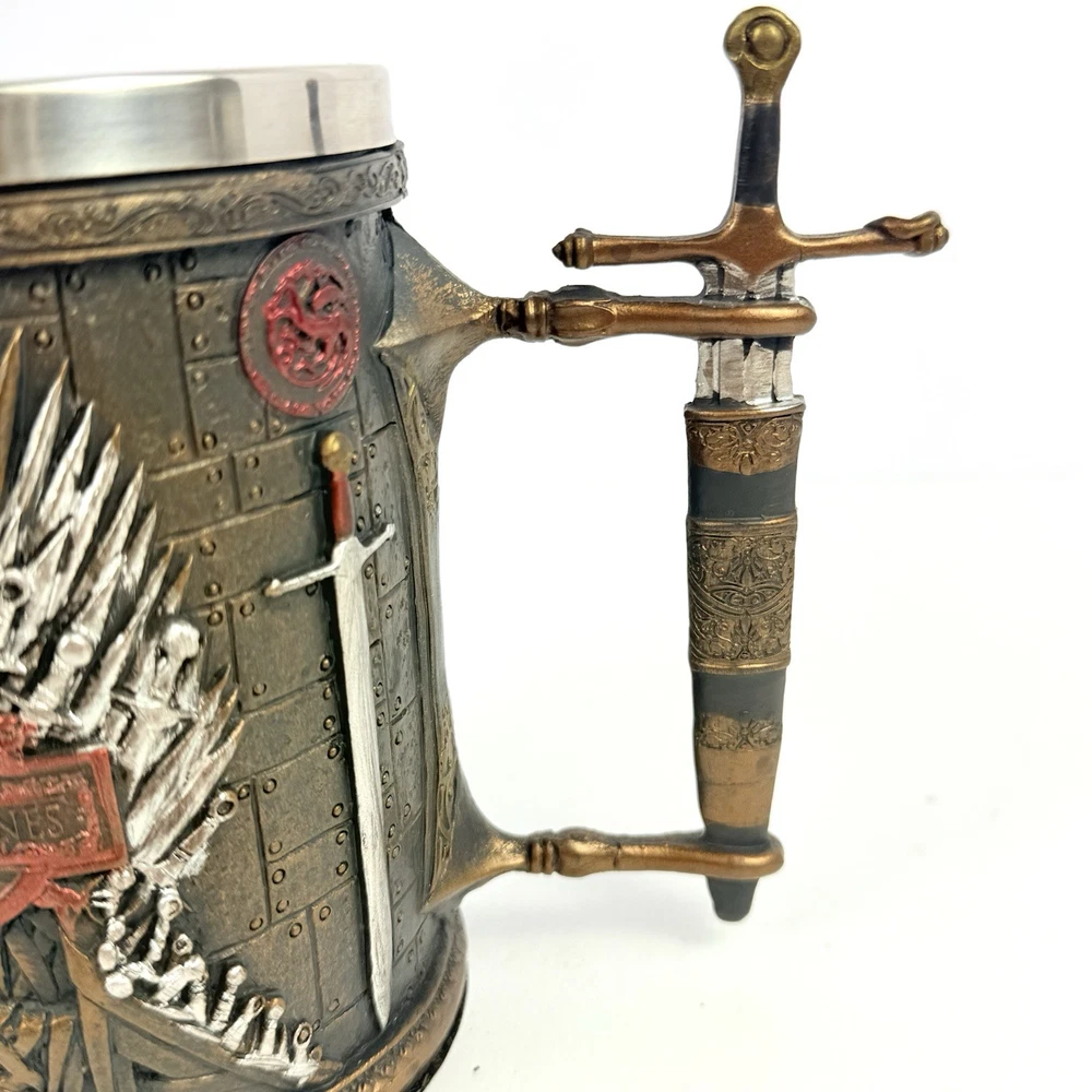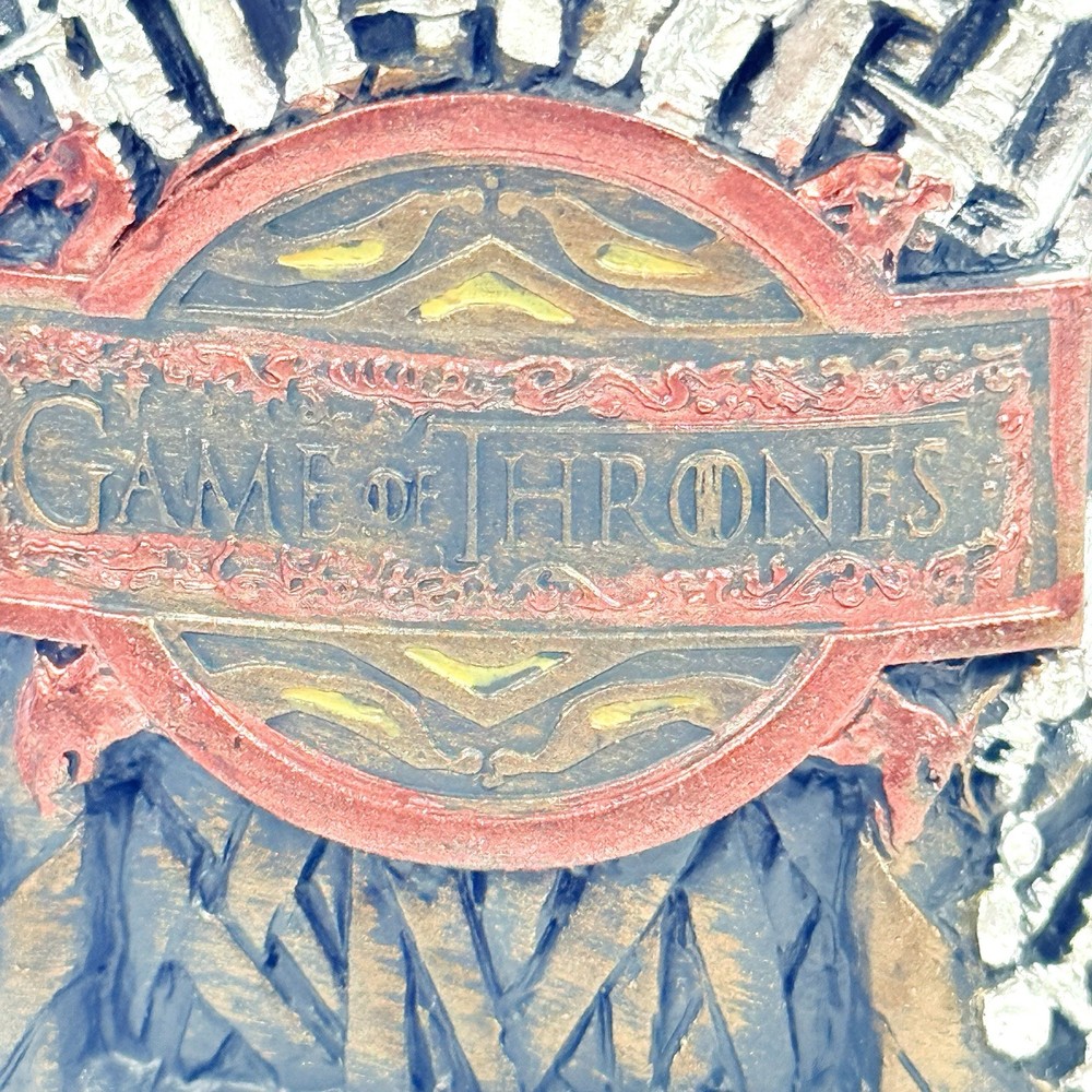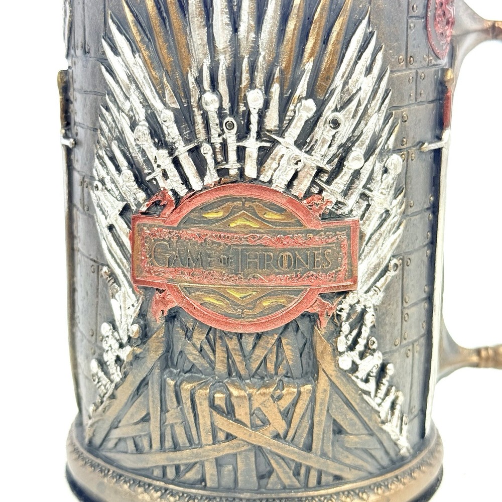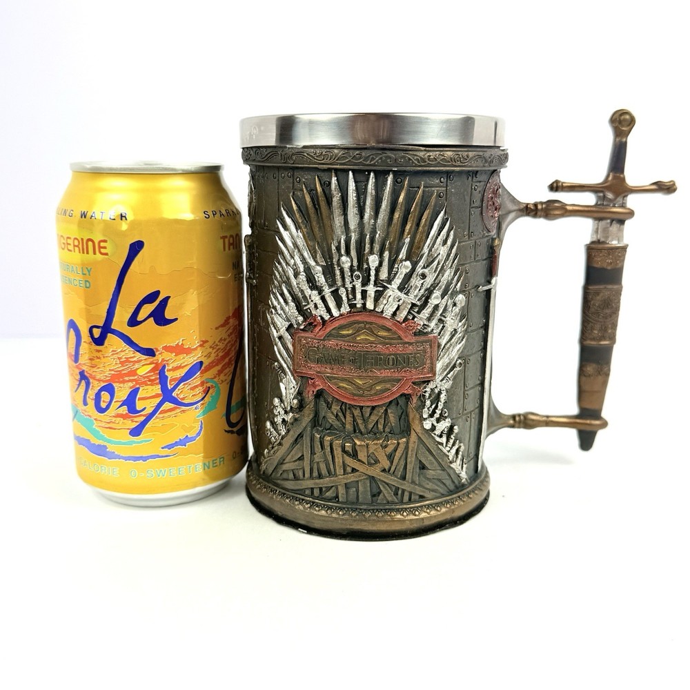 Never used. Game Of Thrones Official Merchandise: Iron Throne Tankard Only the mighty can drink from the Game of Thrones Iron Throne Tankard. Beer, water, milk, coffee (it is suitable for hot and cold drinks) — no matter your beverage of choice — you’ll look stronger when you’re drinking out of this detailed tankard. As you can see in the pictures, this officially licensed Game of Thrones Tankard is highly detailed and features a raised Iron Throne and the Game of Thrones logo on each side. It is cast in ast in the highest quality resin and is painstakingly hand-painted. Besides for the Iron Thrones, there are details thoughout such as the handle that is formed from a sword. See last photo there is a small gap between stainless steel and resin I want you to be aware of. Measures 5.5” high, 6.5” wide at handle and 3.5” diameter opening. Let me know what questions you have. Blessings to you! 🤎🩶🖤🧡🖤🩶🤎
