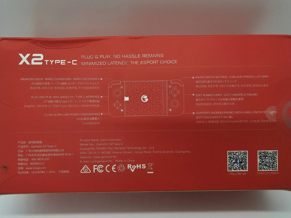 Manufacturer Warranty:1 YearItem Weight:362gMaterial:PlasticModel:GameSir X2SColor:WhiteCable Length:Not ApplicableUPC:6936685219939Compatible Product:SmartphoneConnectivity:Wireless, USB-C, type-cPlatform:AndroidBrand:GameSirgtin13:6936685219939Maximum Number of Players:1Type:Mobile ControllerMPN:Doese not applyCompatible Model:For Android, For SmartphoneCountry/Region of Manufacture:China
