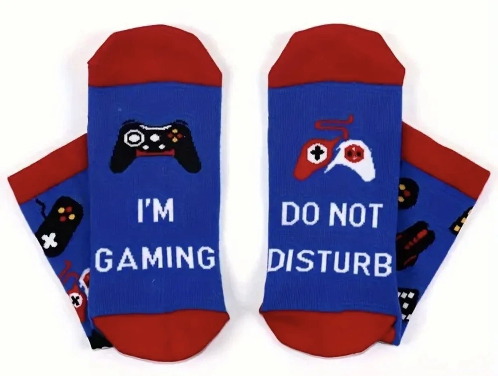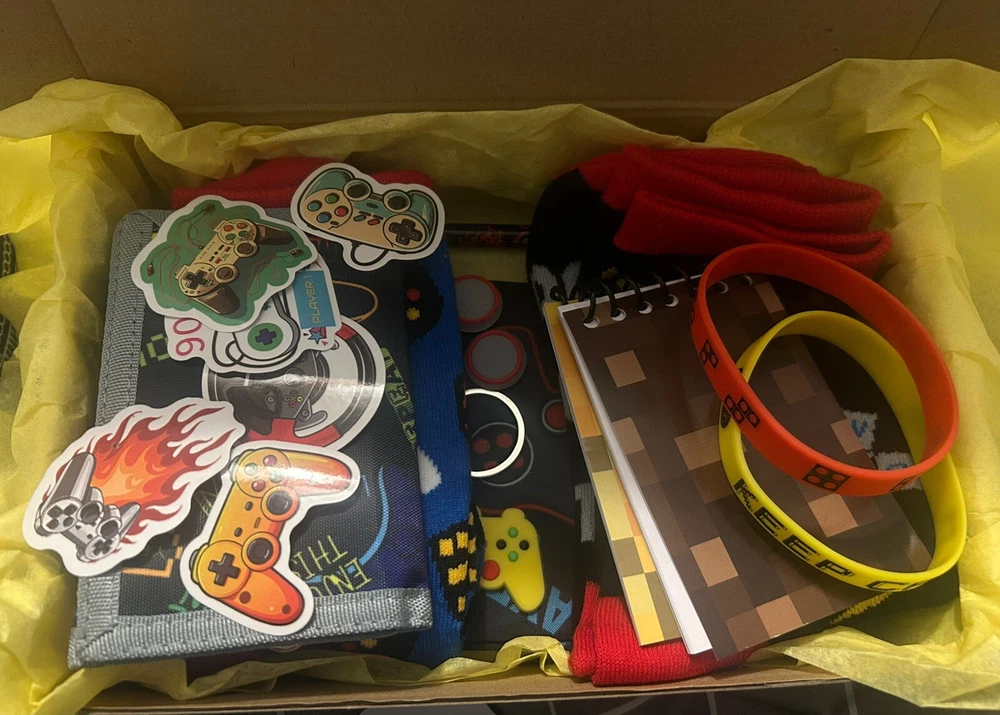 Personalized Gift Box Set Perfect gift for those who love gaming. All items are packed in a 9x6x2 (inch) White Box with color coordinated gift tissue paper. Ready for immediate gift giving! Details of what is included below: RFID Trifold Velcro Wallet (4.7x3.2)(inch) Mini Controller Charm Keychain (about an inch) 2 Pairs of Crew Socks (Size 7-13) 2 Silicone Bracelets A Pair of Silicone Thumb Grips for Controller Gel Turntable Pen 2 Small Notepads Lightweight Drawstring Gym Bag (16.9x13.7)(inch) 6 Waterproof Stickers