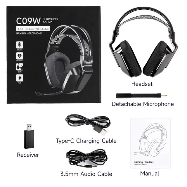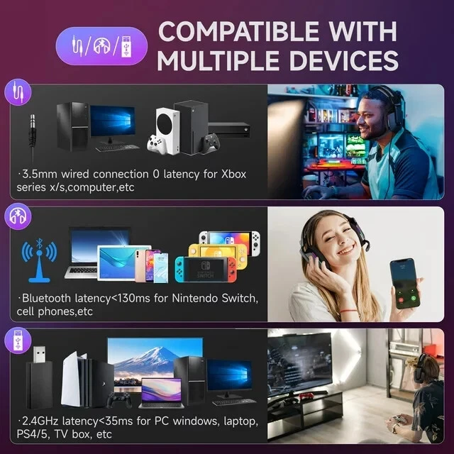 - Brand New - Never Used - Questions: Feel free to ask any Questions - BOX: Never Opened - DESCRIPTION:EasySMX C09W wireless gaming headset with 3 connections mode, 2.4G/Bluetooth/Cable, It is compatible with most gaming device, such as PC, PS4, PS5, Nintendo Switch, Xbox Series, and it is lower latency, doesn't affect gaming experience, 1000mAh battery support for 35-40Hrs long game time, at same time, the C09W combines with cool RGB lighting effects, which enhances the overall beauty and allows you to experience various scenes in the game more immersive.with the customized 50mm drivers, maximizes the accuracy for the specific sound * Invincible Compatible with Device: The 2.4G mode of C09W gaming headset can be connected to PC, PlayStation4, PlayStation5, Mac, laptop, Nintendo Switch via the dongle. Bluetooth mode can be connected with Mobile, Tablets and other Bluetooth devices.3.5mm audio cable mode can be connected with XBox Series. * Long-lasting Battery Life: C09W gaming headset optimizes the overall design to save battery power. It has a longer game time of 35-40Hrs. With cool RGB lighting effect turned on(15-20Hrs). Full-recharge in just 3Hrs. * RGB Lighting Effect: C09W combines with cool RGB lighting effects, which enhances the overall beauty and allows you to experience various scenes in the game more immersive. * Always Be a Winner: with the customized 50mm drivers, maximizes the accuracy for the specific sound like weapon fire, gunshot, etc., and attains a full range of audio from deep bass to sonic highs * Ergonomic Design: Lightweight design, adaptive ear shells, no pressure on the ear, with memory foam ear cups, heat dissipation and breathability. - OFFERS: Reasonable offers are considered, LOWBALLERS, Best price and Lowest askers will be ignored - all sales final/no refunds/ no exchanges/ no returns - Disclaimer: I do not own the brand's trademarks, logos, pictures, or products posted. I do not intend to infringe on copyright. I find such content available on the internet. Contents are considered fair use. -EasySMX C09W Wireless Gaming Headset, Bluetooth Gaming Headphones with Suspension Headband, RGB Lighting, Compatible with PC, PS4, PS5, Detachable Noise Cancelling Microphone, Black
