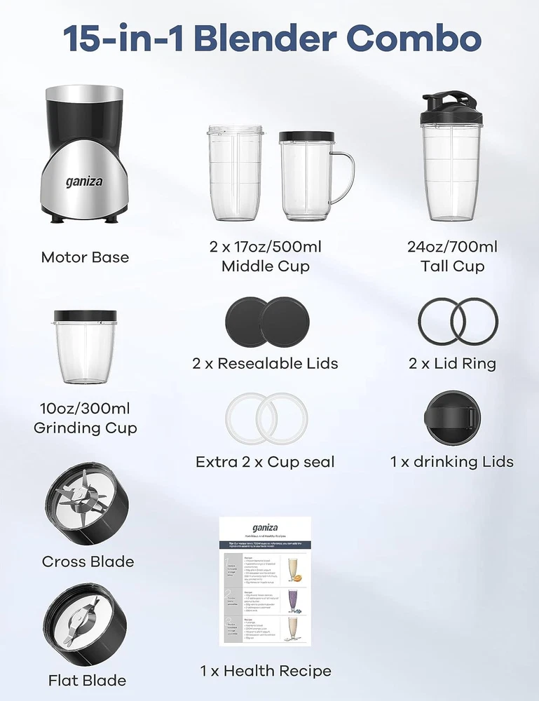 Ganiza Smoothie Blender, Blender for Shakes and Smoothies, 15-Piece Black Product Details Brand: Ganiza Color: Black Special Feature: Multi-Function, Safety Lock, Self-Cleaning, 15-in-1 Countertop Blender and Grinder Combo Capacity: 1.9 Liters Product Dimensions: 12"D x 5.3"W x 10"H Included Components: (1) Peak Power 900W motor base, 6-blade cross, 2-blade flat, 24 oz. portable Cup, (2) 17 Middle 10 grinding to-go lid, lip ring, resealable Lids, Cup Sealing Ring, Recipe. Style: Countertop Blenders Recommended Uses For Product: Mixing, Blending, Juices, Grinding Power Source: Corded Electric Number of Speeds: 1 Voltage: 1.1E+2 Volts Controls Type: Push Button Material Type Free: BPA Free Blade Material: Stainless Steel Manufacturer: Ganiza Item Weight: 4.54 pounds Item model number: GB10 MaterialWattage: Acrylonitrile Butadiene Styrene900 watts Item WeightIs Dishwasher Safe: 4.54 PoundsYes 【Powerful Smoothie Blender】Peak Power 900W Smoothie Blender for Shakes with upgraded full copper turbocharged motor pulse technology, 25000RPW High Speed, faster and stronger, but just as simple to use. Load it up with dense whole foods like nuts, seeds, hard fruits, then push, twist and blend your way to a healthier lifestyle. 【Multi-Function Blenders】Your personal blender comes with a stainless steel 6-blades, make it easy to blend various hardness of ingredients, even crushing ice. Great for blending smoothies, juices, milkshakes, sauces, jams, baby food. A powerful string flat blades use cyclonic action to break down tough ingredients, great for grinding like coffee beans, spices. 【Safety First】Your safety is our top priority, Blender for smoothies only works when the blender cup is properly locked into the base. cooling fan on the bottom of the blender for quick heat dissipation. 4 Non-slip silicon pads can keep balance when the smoothies blender is working. 【15-in-1 Countertop Blender and Grinder Combo】(1) Peak Power 900W motor base, (1) 6--blade cross, (1) 2-blade flat, (1) 24 oz. portable Cup, (2) 17 oz. Middle Cup, (1) 10 oz. grinding Cup, (1) to-go lid, (2) lip ring, (2) resealable Lids, (2) Cup Sealing Ring, (1) Recipe. 【Cleaning Friendly】Cleaning is a breeze – just add soap and warm water, and the blender will start its self after properly locked into the base. In addition, the smoothie maker can be easily cleaned in a dishwasher, except for the motor part (The Main Body).