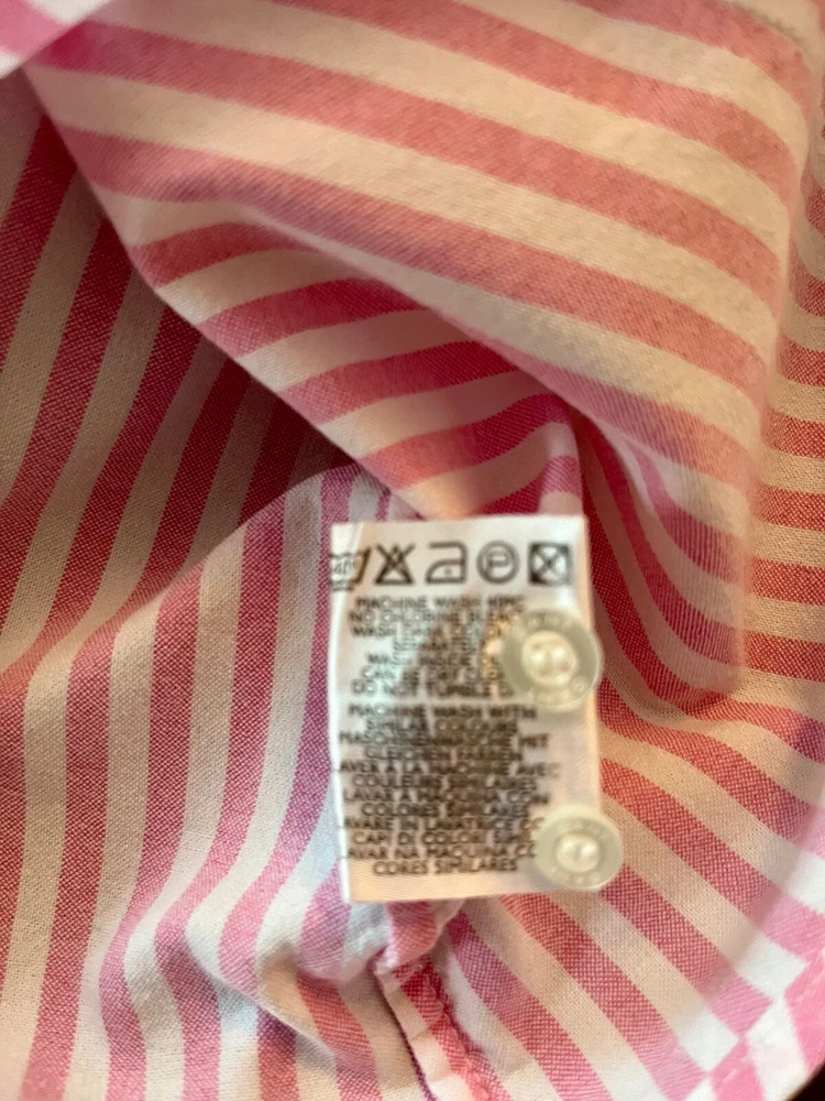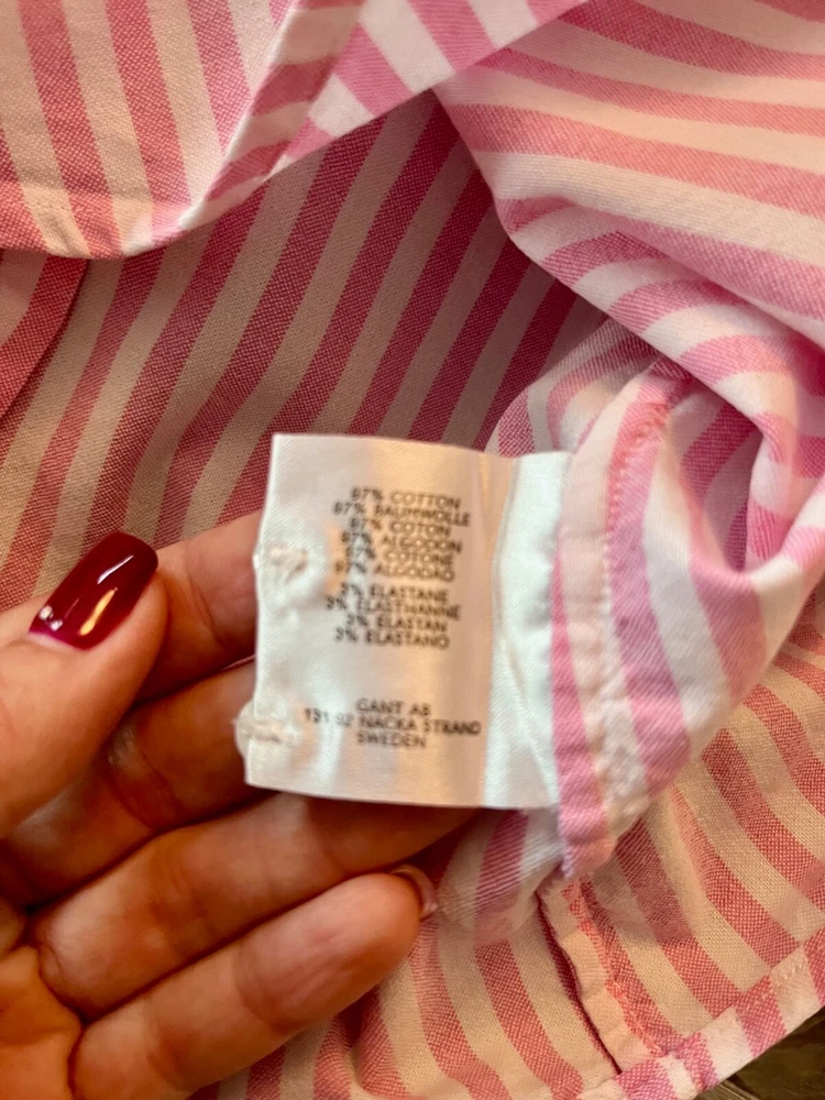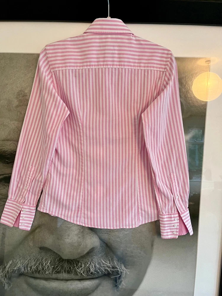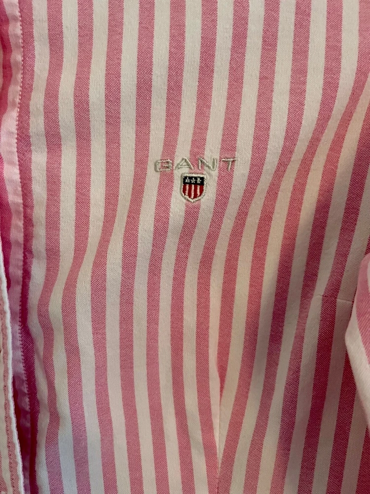Gant ladies slim fit formal shirt pink and white stripes. Slim size UK12 Stunning fitted shirt with discreet logo on the front. Condition is like new. Made of cotton and elastane. Measurements (laid flat): Length: 58cm Shoulders: 40cm Armpit to armpit: 48cm Sleeves: 62cm Ask me any questions. I promise fast delivery. Thank you for shopping.