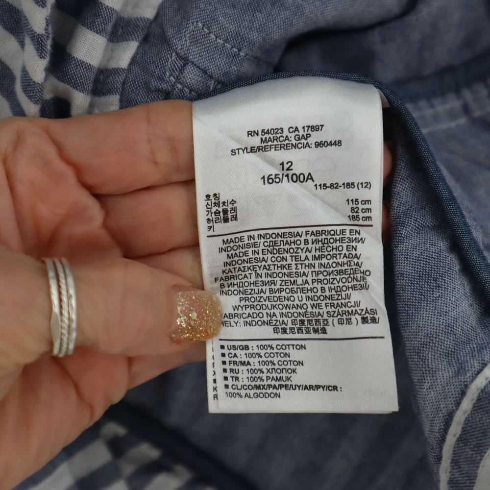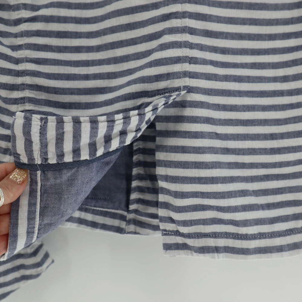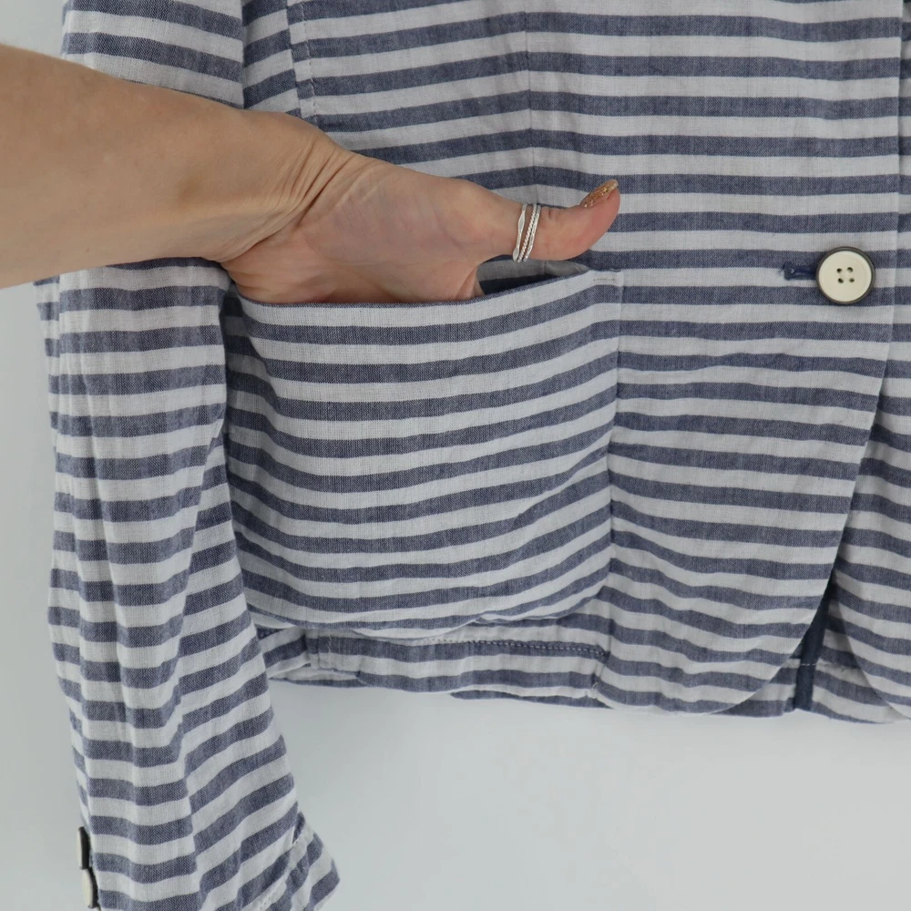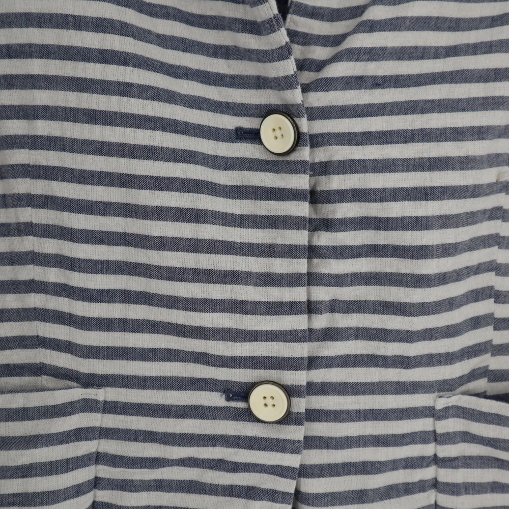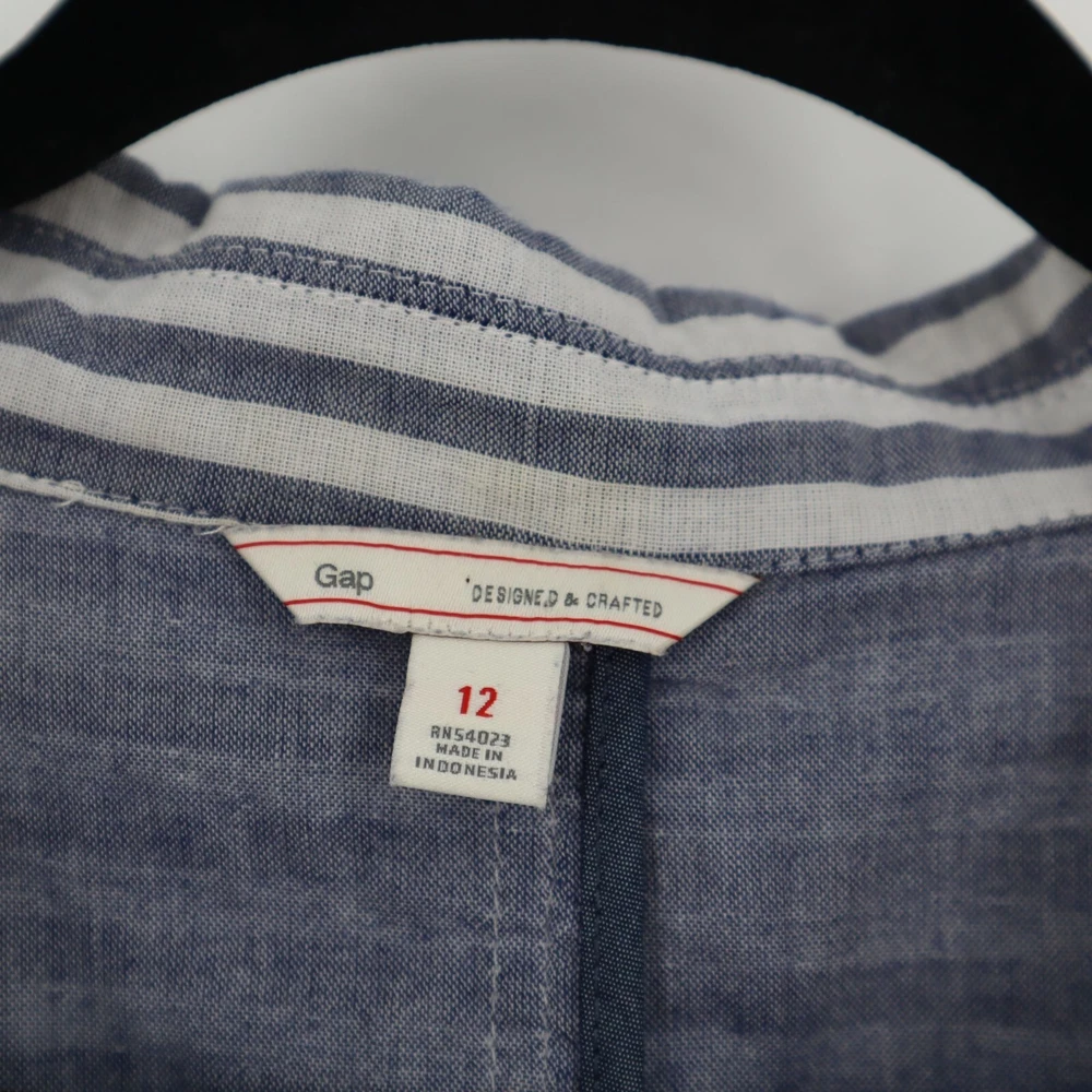Gap Cotton Striped Muslin Blazer Womens Size 12 Casual Lightweight Coastal Beach This Gap Cotton Striped Muslin Blazer is a perfect blend of comfort and style. Featuring a two-button front, back vent, and two pockets, this lightweight blazer is ideal for beachy, coastal travels. • Brand: Gap • Size: Womens 12 • Color: Blue, White • Pattern: Stripes • Material: Cotton • Two-button front • Back vented • Two pockets • Lightweight • Style: Coastal, Beachy, Travel Features: • Coastal, Beachy, Travel, Lightweight • Spring, Summer • Stripes • Made in India • Machine Wash Size: Womens 12 Measurements: Length from center back 23.5 in / 60 cm Bust flat lay 20.5 in / 52 cm Sleeve from neckline 28 in / 71 cm Sleeve from shoulder 24 in / 61 cm Condition: Pre-Owned Good GUC with a faint stain on the front, as seen in photo.