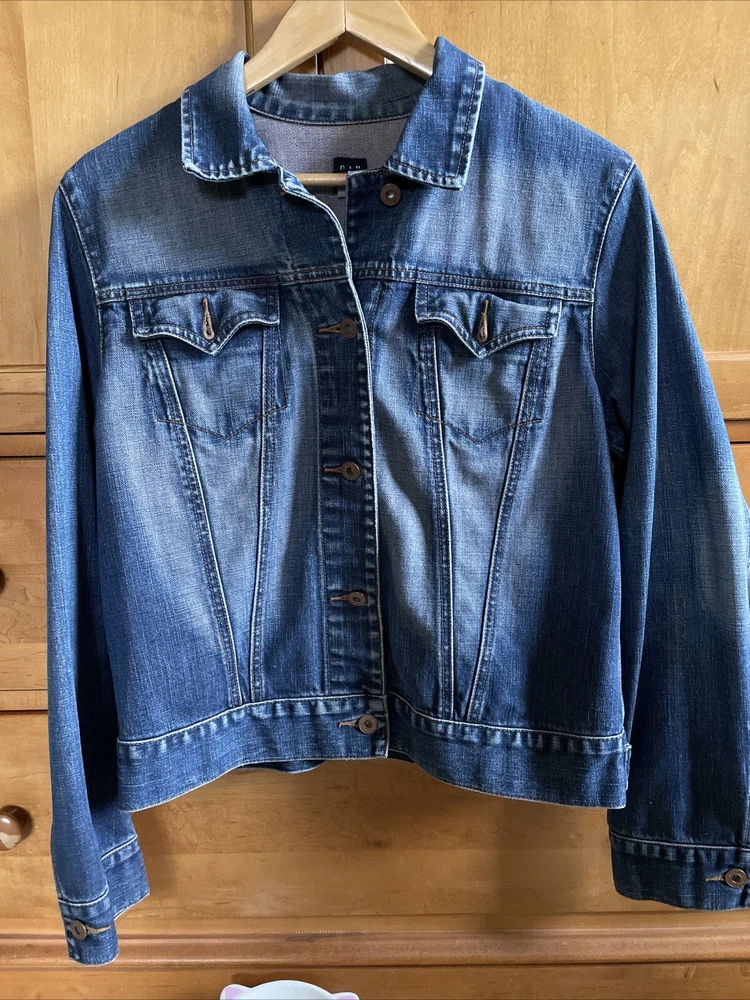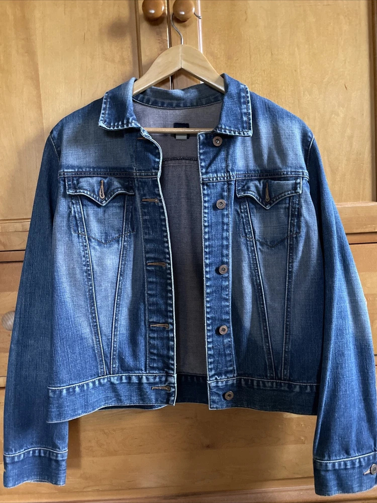 This Gap denim jacket is a must-have for any wardrobe. It features a lightweight and collared design with pockets for added convenience. The jacket is made of cotton and is perfect for both fall and spring seasons. The blue color and basic jacket style make it versatile and easy to pair with any outfit. The jacket also has a unique accent with a T-shirt sewn on the back, adding a touch of personality to the piece. This jacket is perfect for anyone who loves a casual and chic look.