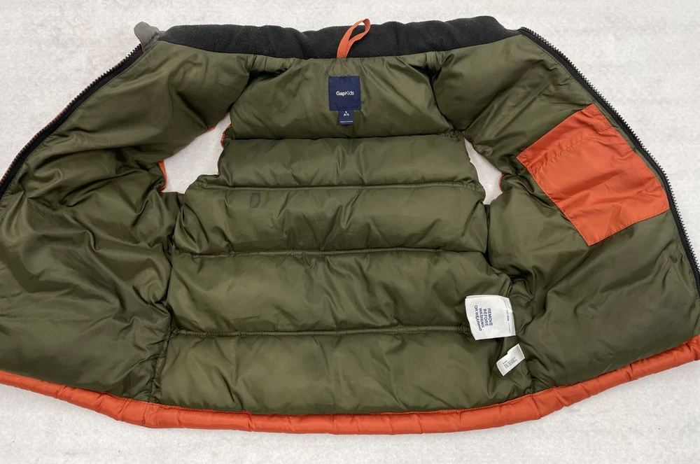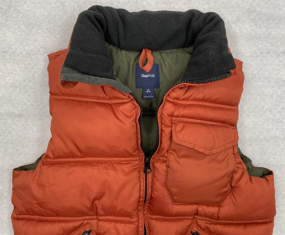 Department: Boys Closure: Zip Outer Shell Material: Polyester Features: Full Zip, Insulated, Pockets Color: Brown Style: Puffer Jacket Type: Vest Brand: Gap Insulation Material: Polyester Size: S