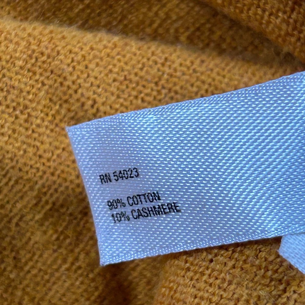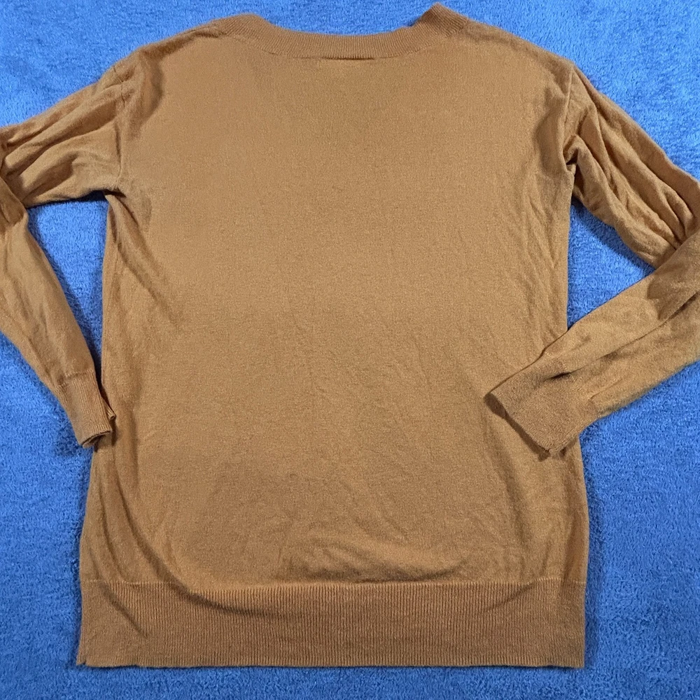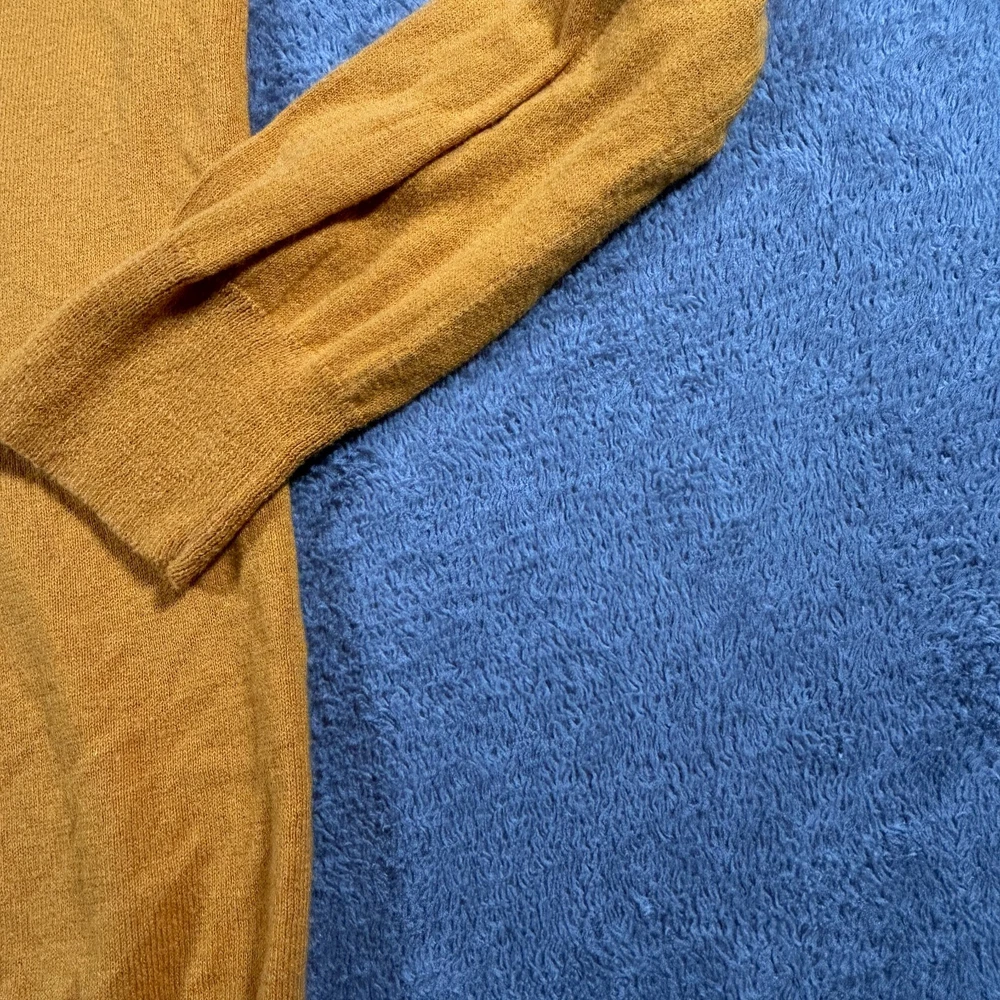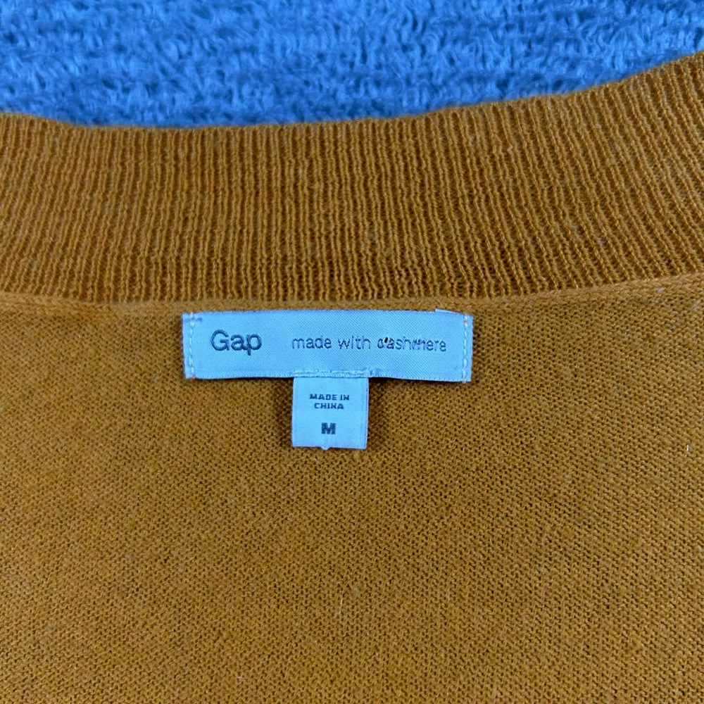 This is a women’s Gap medium sweater featuring a soft and luxurious blend of 90% cotton and 10% cashmere. The camel brown color and classic V-neck design make it perfect for layering or wearing on its own. There is a small stain present, as shown in the photos, but the sweater is otherwise in good condition. Comfortable and stylish, this sweater is a wardrobe essential for fall and winter.