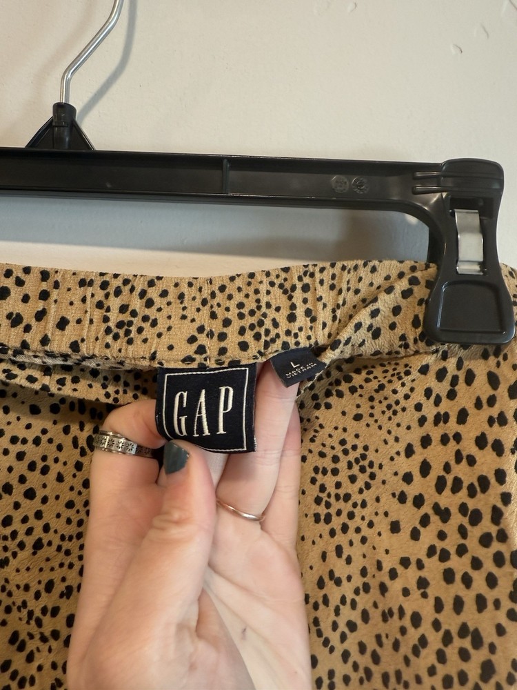 The Gap Tan Animal Print Skirt in size L is a stylish and versatile piece for women. Made by the brand Gap, this peasant-style skirt features a pull-on closure and a midi length, suitable for all seasons. The brown animal print design adds a fun and trendy touch to any outfit, perfect for both casual and dressy occasions. This lightweight skirt is easy to wear and comfortable, making it a great addition to any wardrobe.