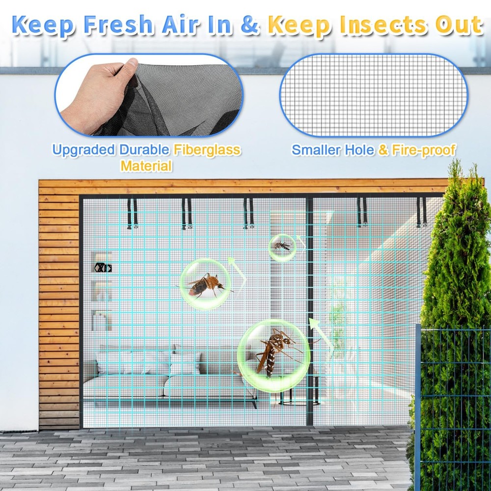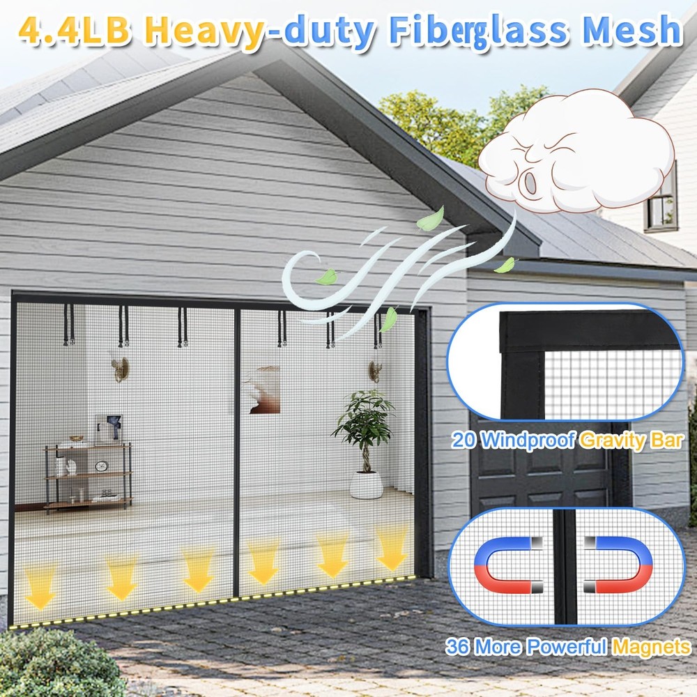 Garage Door Screen 2 Car 16x7ft Magnetic Closure Heavy Duty Weighted Bottom Garage Screen Door, Magnetic Garage Door Screen, Hands Free with 6 Roll Up Starps for Patio, Outdoor, Gym, Crafts Sun House Porch, Reinforced Fiberglass Garage Door Screen, Magnetic Screen Garage with Retractable Fiberglass Mesh and Heavy Duty Weighted Bottom, Hands Free Screen Door, Magnetic Closure Heavy Duty Weighted Bottom Garage Screen Doors for 2 Car Garage, Magnetic Screen Garage with Retractable Fiberglass Mesh, Hands Free Door Screen Kit, Reinforced Self Sealing Fiberglass Mesh Door, Hands Free Door Screen with Closure Weighted Bottom, Garage Door Screen for 2 Car Garage, Fiberglass Mesh Door Screen with Closure Weighted Bottom, Durable Magnetic Heavy Duty Screen Door Curtain Cover Kit with 6 Strapping Tapes, Hands-Free Screen Door Mesh for Garage Door, Hands Free Retractable Garage Net Screen Door Mesh, Magnetic Garage Screen Door for 2 Car Garage 16x7 Ft, Breathable Screen Door Curtain Cover Kit, Sturdy Heavy Duty Fiberglass Mesh Door Screen with Magnets 【Fit 16x7ft Garage Door】Our instant Garage Screen Door is designed to fit 16.4x7.2ft garage doors. It accommodates door sizes up to 191"-193" in width and 83"-84" in height. Can be used as replacement for a fixed screen door and fits front, rear, interior or exterior, entry, patio, deck, porch, balcony, glass, and more. Please Measure your door first and reserve some extra length and width for the door frame, choose the size according to outer diameter 【Upgraded Fiberglass Material Garage Door Screen】The Magnetic Garage Screen Door is made of durable antioxidant glass fiber material: Tearing resistance, fire resistance, breathable, wear-resistant and aesthetic characteristic. The width of the top is widened to 1.5 inches to increase the load-bearing capacity of the hook&loop. Reinforcing the sewn edges to prevent fraying and ensure that nothing sneaks through the sides 【Open Easily & Close Automatically Door Net Screen】The Garage Screen Doors for 2 Car Garage Pull Down is equipped with 36 powerful magnets, it ensures that your Screen Door automatically closes smoothly and tightly. Its hands-free walk-through design lets you enter effortlessly, while 20 weighted rods keep Garage Net Screen flush to the ground—no gaps, no mosquitoes, no frustration. Kids, dogs and cats can go inside and outside of the house with ease 【Keep Bugs Out & Let Air In Screen Door Mesh】With its fine mesh construction, the Retractable Garage Door Screen can effectively prevent insects, mosquitoes and other small animals from entering your garage. Perfect for increasing airflow in your garage, and its good transmittance can give you a better vision, turning your garage into an extra living space in the summer 【Easy Installation Garage Net Screen】The Garage Door Net Screen with Magnet comes with completely assembly kit with step-by-step instruction for easily installation. Simply attach the screen to the door frame with the included hook and loop tape. Extra push pins are included for added security and strength. 6 strapping tapes at the top allows you to roll up the Garage Mesh Screen and secure it to the top. Roll the Garage Bug Screen out of the way when not in use 【Widely Used Magnetic Screen Door】This Garage Mesh Screen can be used as a substitute for fixed screens, suitable for front, rear, internal or external entry, terraces, terraces, porches, balconies, etc. It also fits for back patio, apartment balcony, outdoor workshop, a home gym, garden, floor to ceiling windows of veranda etc. If you have any questions about the Garage Screen Cover, please feel free to contact us through Amazon, 24 on-line support offer quick solution for you