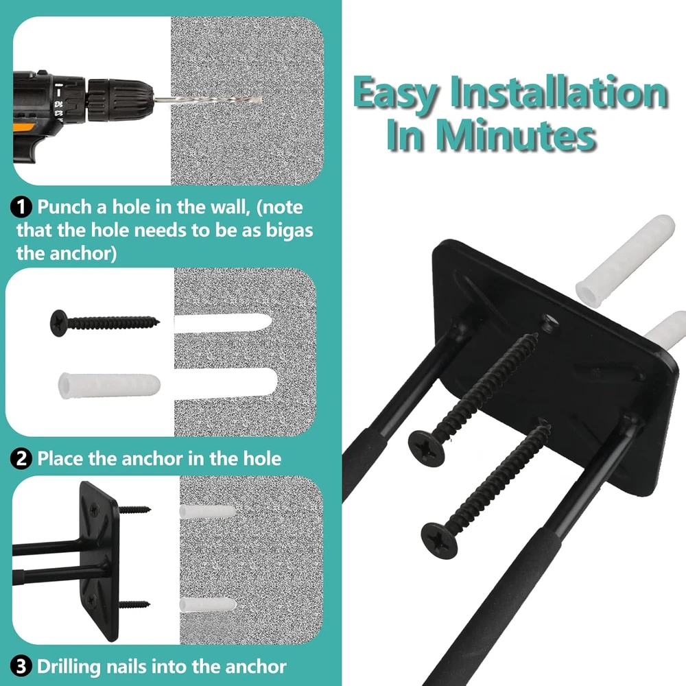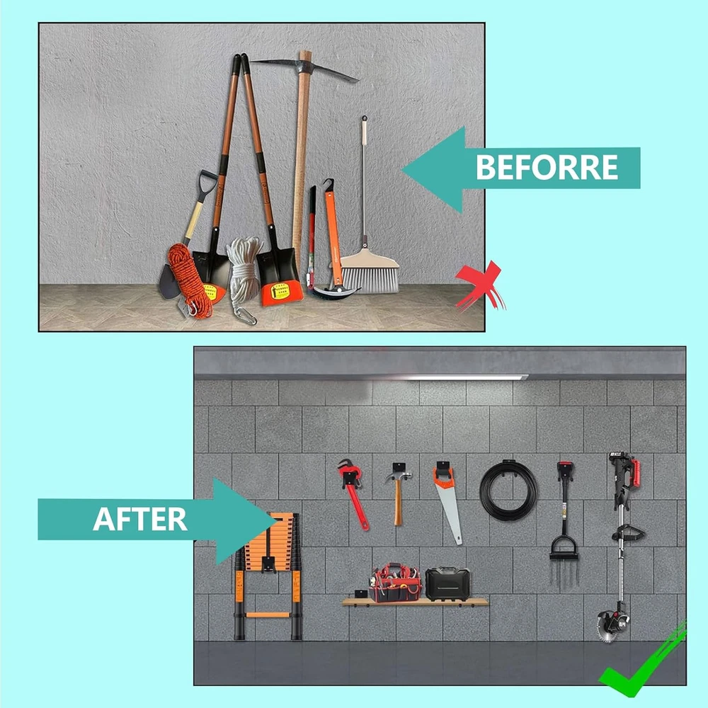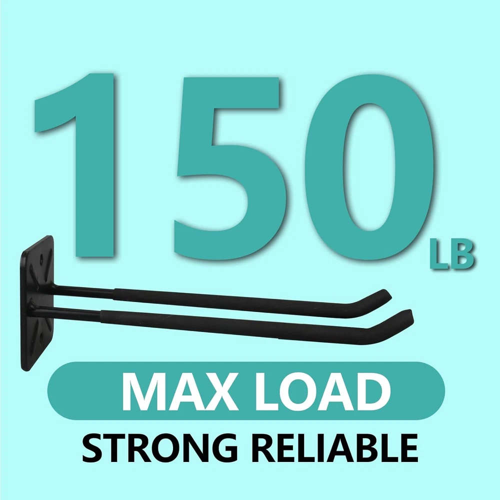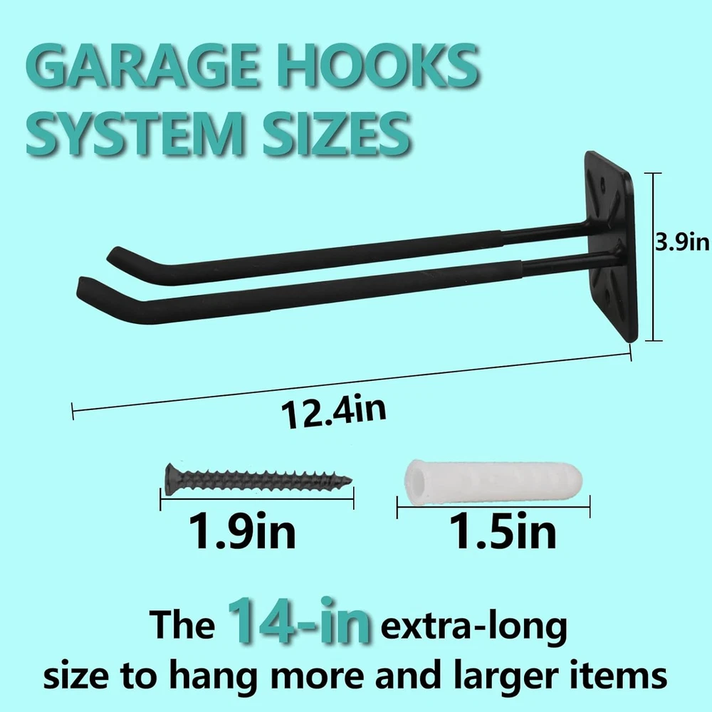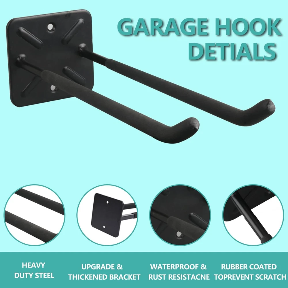 【Premium Alloy Steel】--INDECKMO garage hook made of high-quality materials. Garage hooks are constructed from solid and heavy-duty solid steel for industrial-grade strength and longevity. The hook can hold approximately 150 pounds. 【Non-slip rubber-coated】: Garage hooks with rubber coating can effectively prevent items from being scratched or slipping and provide cushioning, which will extend the service life of the garage hook. 【Double Hooks Design】: Thicker base increases the stability of the garage hook and makes it less likely to deform under pressure. The practical double hook design hangs tools securely enough to prevent the hook from wobbling or moving. 【Easy To Install】Hooks are ready to use out of the box and include all mounting hardware. With 2 screws, you can mount hooks securely to the wall. Free up some valuable space in your garage.(Kindly Note: Must be located to solid structures.) 【Space Saving】: 12.4 inch long utility storage hooks can help you to storage many garage tools. Organize heavy-duty tools in the garage, garden, shop, basement, or warehouse. such as ski boards, tires, garden hoses, cords, cables, brooms, garden tools, folding chairs chairs, sports gear, rain boots, rakes, shovels, shelfs etc. Product Description Strength and Durability A thicker pole is generally stronger and more durable than a thinner one. This increased strength allows the tire hook to withstand higher loads without bending or deforming. It is especially important when the tire hook is intended to support the weight of heavy tires. Optimized Space Utilization By utilizing a double hook design, users can make more efficient use of available space for tire storage. The dual hooks allow tires to be stacked or arranged in a way that maximizes vertical space while maintaining stability and accessibility. Protection Against Scratches Rubberhook lagging provides a protective layer that helps prevent scratches and abrasions on the surface of the tires. When the hooks are coated with PVC, they create a soft barrier between the tire and the metal hook, reducing the risk of cosmetic damage to the tire sidewalls. Heavy-Duty Hooks Some tire hooks are designed to be heavy-duty and can support larger or heavier tires, such as those for SUVs or trucks. These hooks may have higher weight capacities. Space Saving Tire hooks help maximize floor space by allowing you to hang tires on the wall or ceiling. This can be particularly useful in smaller garages where floor space is limited. Strength and Durability A thicker pole is generally stronger and more durable than a thinner one. This increased strength allows the tire hook to withstand higher loads without bending or deforming. It is especially important when the tire hook is intended to support the weight of heavy tires.