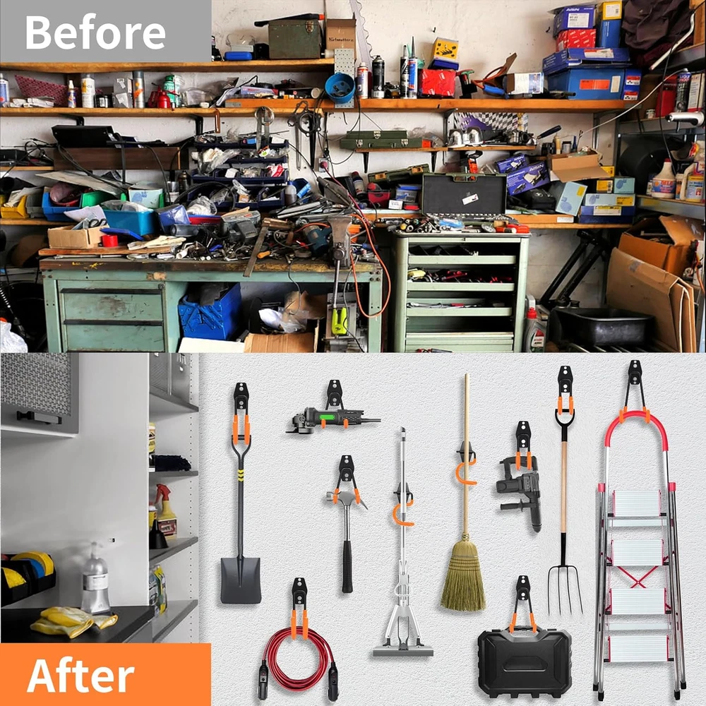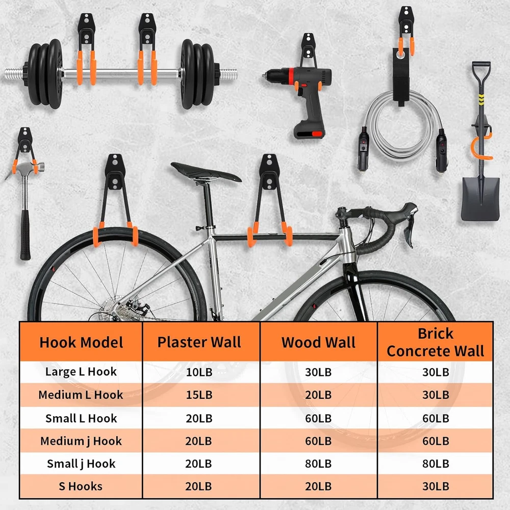 【Hanging Garage Hooks of Various Sizes】This garage bike hook set includes 14 garage tool hooks, 2 rope storage straps, screws, and wall anchors. The garage has 5 sizes of practical hooks: 2 large square hooks, 2 medium square hooks, 4 small square hooks, 2 medium J hooks, 2 small J hooks, 2 S hooks with 2 different drywall or concrete wall anchors. 【Premium Material】The garage wall hooks are made of high quality carbon steel and coated with non-slip rubber. These utility garage hooks are of excellent rust and corrosion resistance. Our bike hooks for garage wall are very sturdy and durable, great for organizing and hanging items in your garage. 【Wide Application】The set of garage storage system hooks can be used in garage, shed, warehouse, garden, shop and barn to organize your bikes, ladders, garden tools, power tools, shovel, broom, fishing poles, golf bags or bulk items. 【Easy to Install】It is easy to install those garage hanging hooks with screws and anchors. For plaster wall, you need to use the drywall anchors to install the garage hangers on the wall. For brick or concrete walls, you need to use the other type of wall anchors for added support. 【Space-Saving Tool Hooks】With these shed hooks, you can make full use of wall space and save more space for other items. By using these smartly designed bike hangers , you can save a lot of space of your house and garage. These garage organization hooks are perfect for crowded places. Product Description EZ COZY 16 Pack Garage Hooks - Keep Things Organized and Make Life Easier The heavy duty garage hooks are made of sturdy steel material, and covered with rubber to protect your things from scratching or falling down. The garage wall hooks can be used in garage, shed, warehouse, garden, shop and barn. The set of garage hangers are designed to organize your bikes, ladders, garden tools, power tools, shovel, broom, or bulk items. You can make full use of wall space and save more space for other items with this utility hooks for garage. Equipped with two types of screws and anchors, the garage storage hooks can be easily installed on various walls with only an electric drill and a screwdriver, keeping everything in order. There are multiple sizes of garage hangers to fit all of your needs ranging from items as big as bicycles to the smaller ones like extension cord, perfect for hanging garden tools. Organize your garage with these 16 durable, wall-mounted hooks. Juego de 16 ganchos de pared para garaje, resistentes y duraderos, ideales para bicicletas, escaleras, cuerdas, herramientas y más. Incluye 2 correas para cables de extensión. El color naranja facilita la identificación de tus objetos. Do the hooks need to be mounted into studs? No, they can be mounted into drywall or concrete with the included anchors. Will these hooks rust over time? No, the carbon steel material is coated to prevent rust and corrosion. Are installation tools included? Yes, screws and two types of anchors are provided for installing into different wall types. What color are the garage organization hooks? The wall hooks come in a bright orange color for high visibility in the garage. What is the weight capacity of each hangar? It is in the listing. Depends on which hook and how it is attached to the wall.