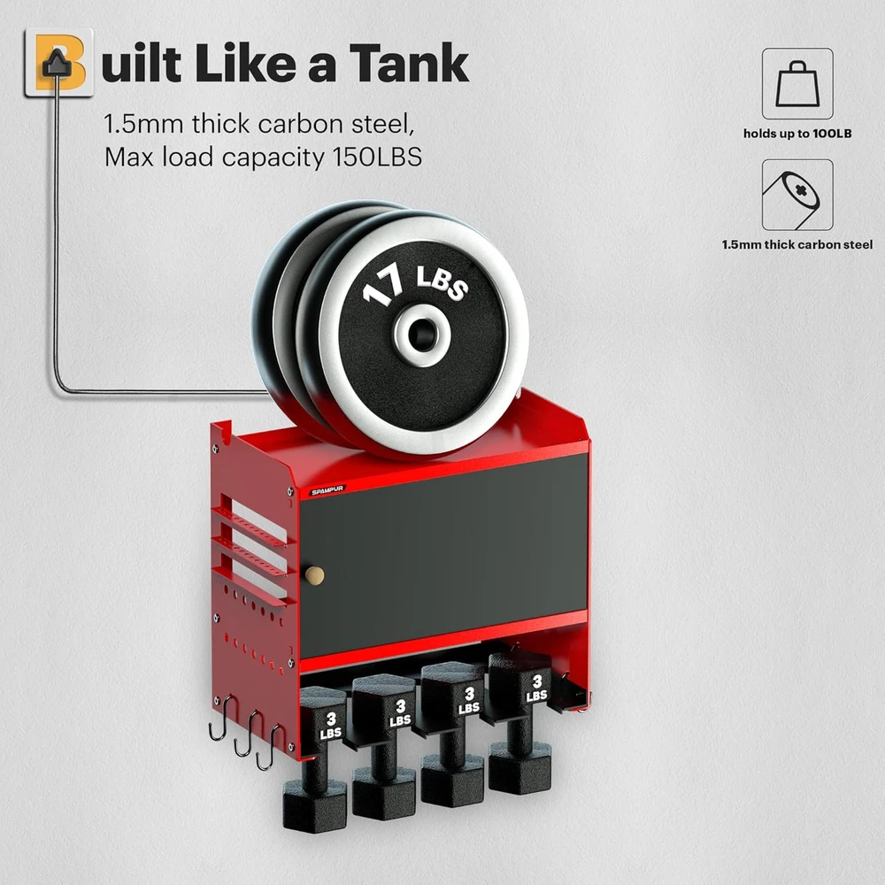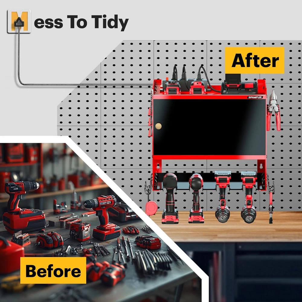 Expert in Power Tool Storage: power tool box with charging station, come with 4 outlets and a tool cabinet with a door, you can charge everything right in the rack and avoid searching for sockets,valuable tools can be stored in the cabinet for better protection Garage Wall Storage Cabinet: power tool wall cabinet features heavy-duty welded steel contruction, It includes 4 power tool slots and a cabinet for convenient storage of Power Tools, Batteries, Battery Chargers and other workshop accessories and supplies Multi purpose: More storage space has been added on both sides of the wall mounted tool cabinet for storing various small tools such as drills, hammers, screwdrivers, and also comes with 6 S-hooks for hanging tape measures or wrenches. Suitable for use in tool rooms, garages, warehouses, and repair shops Easy to assemble: Quickly organize in 15 minutes, we are equipped with installation tools and instruction manuals. The shelves of the power tool organizer cabinet are made of thick gauge steel, which is durable and the best gift for men's Christmas or Father's Day After-sales Service: "Spampur" is a professional tool organizer design and production company, specializing in storage rack systems. If you have any questions about our garage wall shelving, please feel free to contact us, We will provide you with a satisfactory solution Product Description Spamur Garage Storage System Add to Cart Add to Cart Add to Cart Add to Cart Add to Cart Customer Reviews 4.3 out of 5 stars 45 4.4 out of 5 stars 196 4.6 out of 5 stars 1,759 4.6 out of 5 stars 493 4.4 out of 5 stars 23 Price $31.99 $ 31 . 99 $59.69 $ 59 . 69 $40.49 $ 40 . 49 $53.19 $ 53 . 19 $69.99 $ 69 . 99 Material Iron Iron Iron Iron Iron Tier 3 4 3 3 4 Number of Drill Holder 4 8 8 6 8 Color Red Black Black Red Red Featuer Water proof+anti scratch Water proof+anti scratch Water proof+anti scratch Water proof+anti scratch Water proof+anti scratch