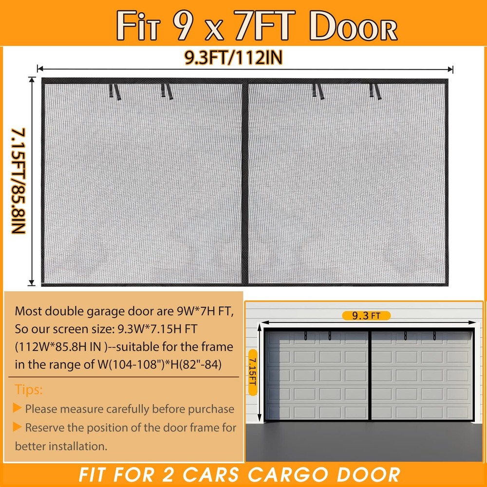 【FIT 9x7FT GARAGE DOOR】:Our 9.3x7.15 FT instant garage net screen fits all door sizes up to (104"-108")x(82"-84")! , please reserve extra length and width for door frame. not only for your garage, but also can replace fixed screen ,fit for patio, outdoor workshop, a home gym, an arts and crafts room, garden, floor to ceiling windows of veranda, kid's playroom as patio screen mesh,porch screen. IMPORTANT: Measure your garage twice before ordering. 【SUPER STRONG FIBERGLASS MATERIAL】: Garage Screen Door Made of ultra-durable fiberglass instead of the polyester. It weighs 1500g (3.3lb),built with 38-strong magnetic points.Use more wear-resistant, beautifully patterned fabric to prevent the magnet from falling off. Tearing resistance, fire resistance, breathable, Wear-resistant and aesthetic characteristic. 【WIND RESISTANCE】: Garage door screen 1 car is not the kind of door screen that can be opened by the breeze. Our mosquito net for garage door 38 strong magnets and extra 10 pcs gravity stick (Others only have 4) in the bottom ,so make sure the screen curtain to close instantly. Kids, dogs and cats can go inside and outside of the house with ease . 【THE LATEST DESIGN】:6 strapping tapes are directly sewn on the garage door screen.It is convenient for vehicles to drive in and out. ( No manual installation is required. )The iron garage door is closed and raised. Please roll up the screen to prevent magnets from sticking to the iron door !!! 【Use With Confidence】- We offer great customer service. If you have any problem just contact us and we will speed up to resolve the problem. we will solve the problem online for you.