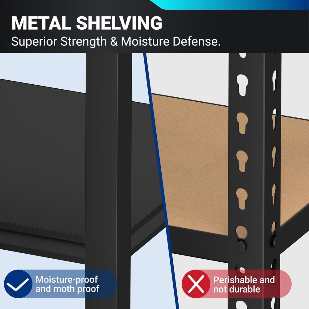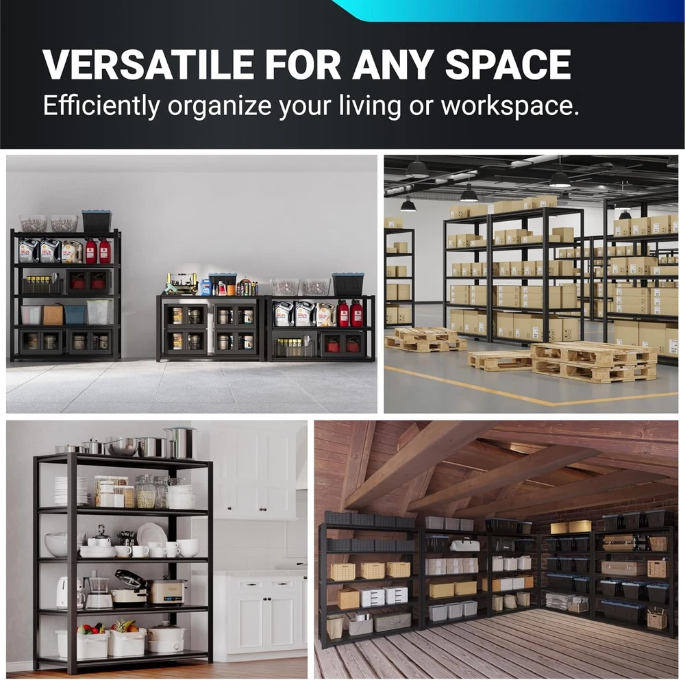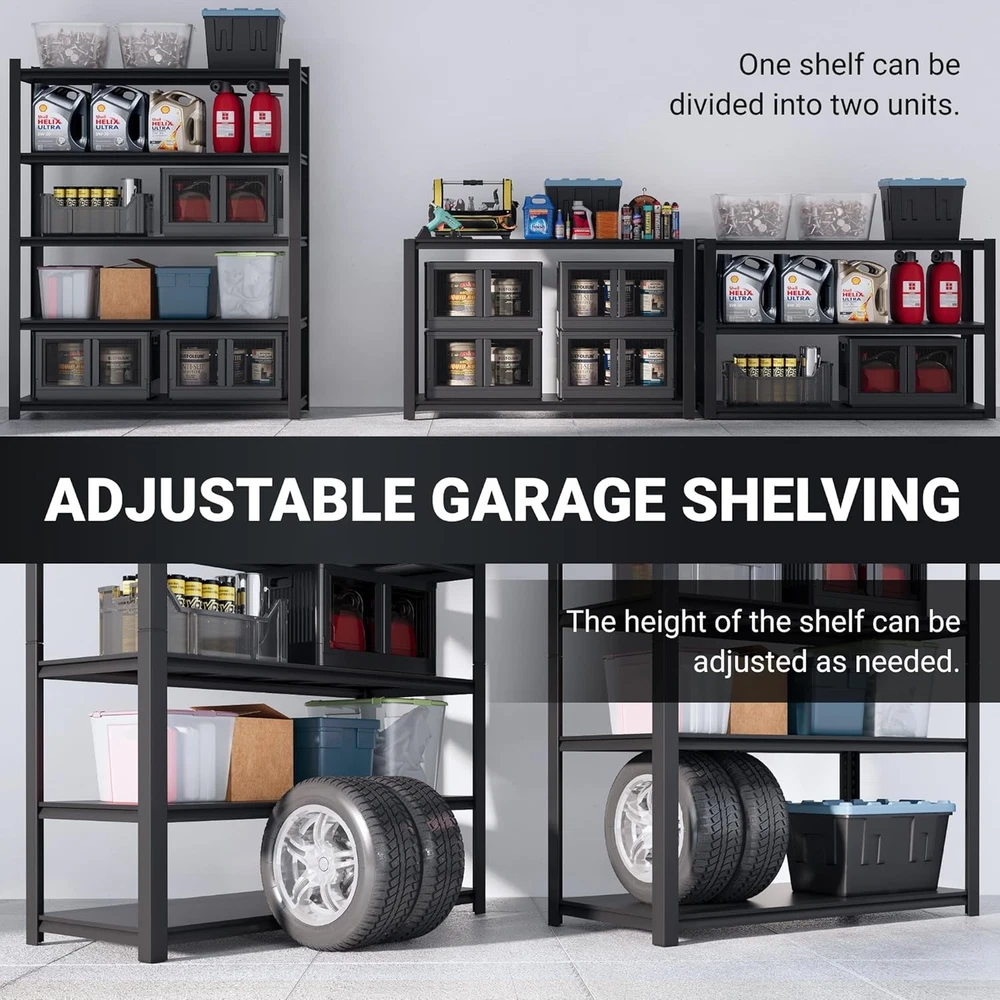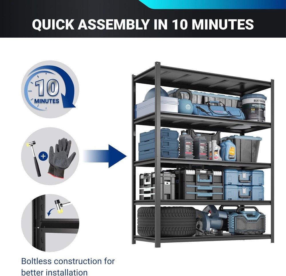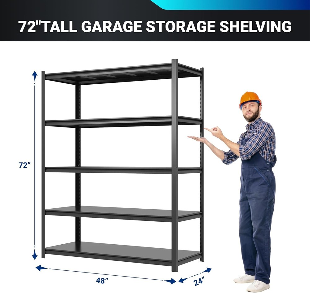 Product Description About this item Heavy Duty Capacity: This metal shelf can easily hold up to 2000 lbs with each shelf rated for 400 lbs. Steel post connectors provide superior strength and stability for all your storage needs. Versatile for Any Space Saving Plan: Mearsuring 48"W x 24"D x 72"H, this sturdy shelving neatly arranges items in garages, kitchen, sheds, attics and warehouses. The metal shelf is perfect for a variety of applications. Easy Self-Assembly: Interlocking design allows easy assembly within 10minutes without tools. Comes with all hardware including mallet and gloves for quick installation anywhere. Maximum Durability and Lifetime of Use - The carbon steel construction coupled with a durable rust-proof paint coating protects against wear and moisture damage, so you can feel confident relying on its strength year after year. Customizable Storage: Shelves are height adjustable for optimal organizcation. One shelving can be converted into two storage units. Plus, individual shelves split in two for versatile configurations to fully utilize your space. Previous page Next page