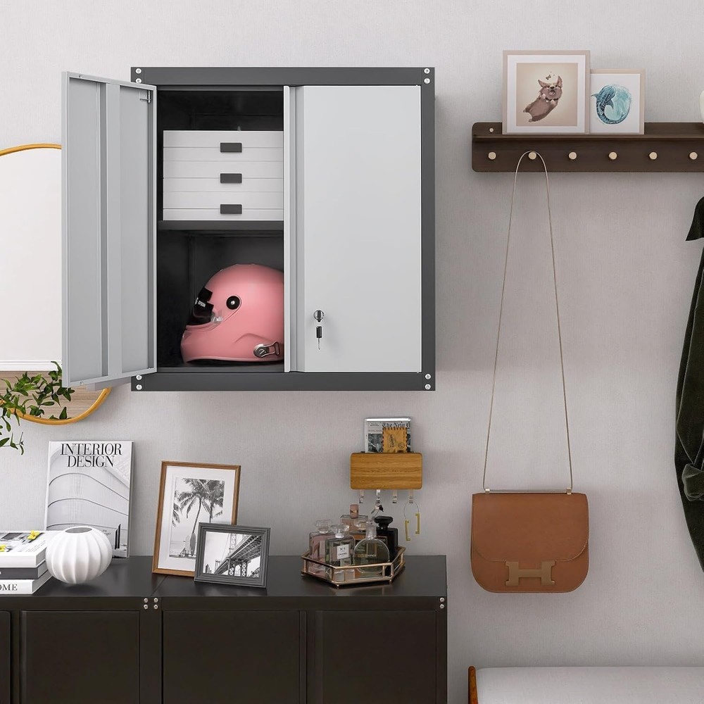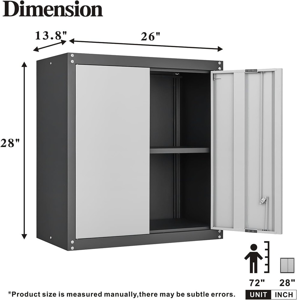Product Description bout this item • 【Versatile Storage Solution】This metal garage storage cabinets (13.78"D x 25.98"W x 27.95"H) is perfect for any space—whether it’s your home office, kitchen, garage, or utility room. Constructed from durable materials, this metal cabinet storage is designed to withstand daily use. It’s a reliable and long-lasting storage solution, ideal for keeping your space tidy and organized. • 【Secure and Convenient】The wall mount storage cabinet features two doors with a lock and two keys, providing added security for your valuable items. You can store important documents, tools, or supplies safely and securely. • 【Adjustable Shelf for Flexible Storage】Equipped with an adjustable shelf, this garage wall cabinet allows you to organize your items based on size and need. Whether you're storing small kitchen appliances or office supplies, the flexible layout ensures everything fits perfectly. • 【Stylish and Modern Design】Available in three elegant colors—Black, White, and Grey—this locking cabinet complements any décor. Its clean lines and modern design make it a stylish addition to any room. • 【Reliable After-Sales Service】If you have any issues after receiving the storage cabinet for garage, you can contact us promptly without any worries. We are dedicated to providing you with the best service. Key lock Protect your belongings, comes with two keys, more reliable 3-point lock Enhance the anti-theft property of metal cabinet doors and improve overall stability Magnetic closure Avoid door panel collision and no manual adjustment required Adjustable shelf Flexibly adapt to different storage needs and enhance the practicality of metal cabinets On Aug 15, 2025 at 02:40:27 PDT, seller added the following information: