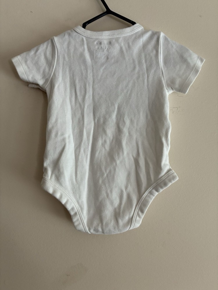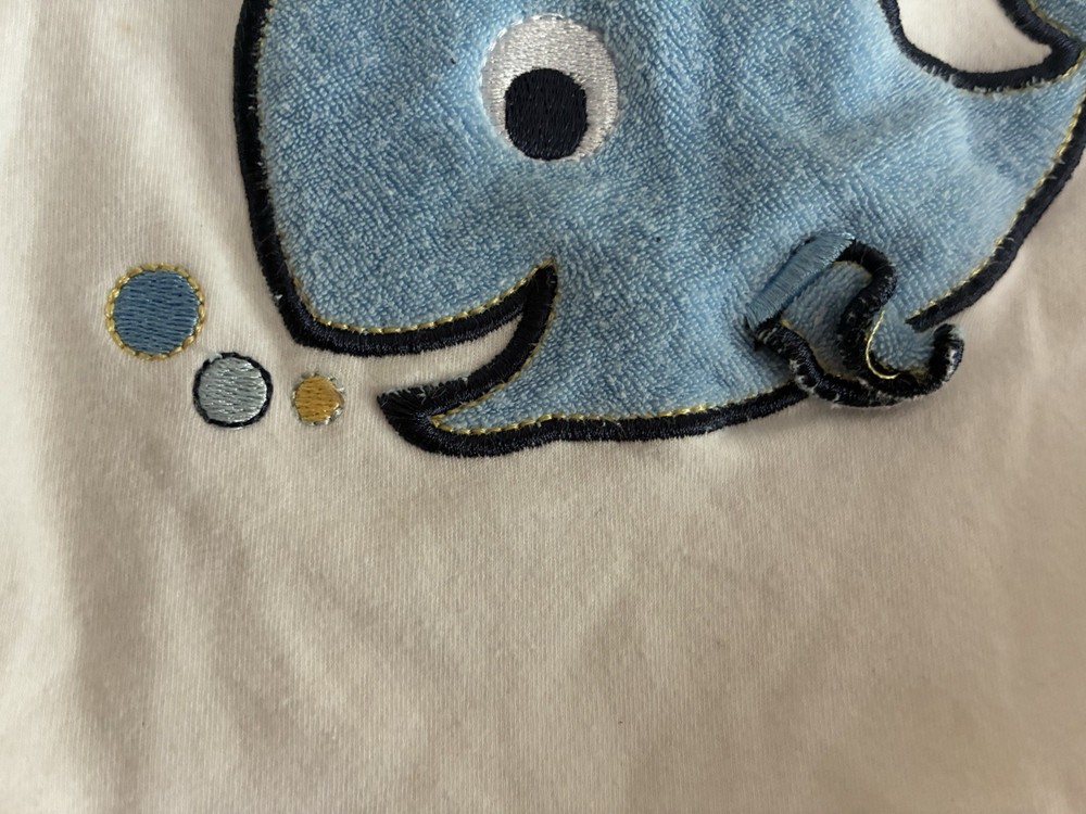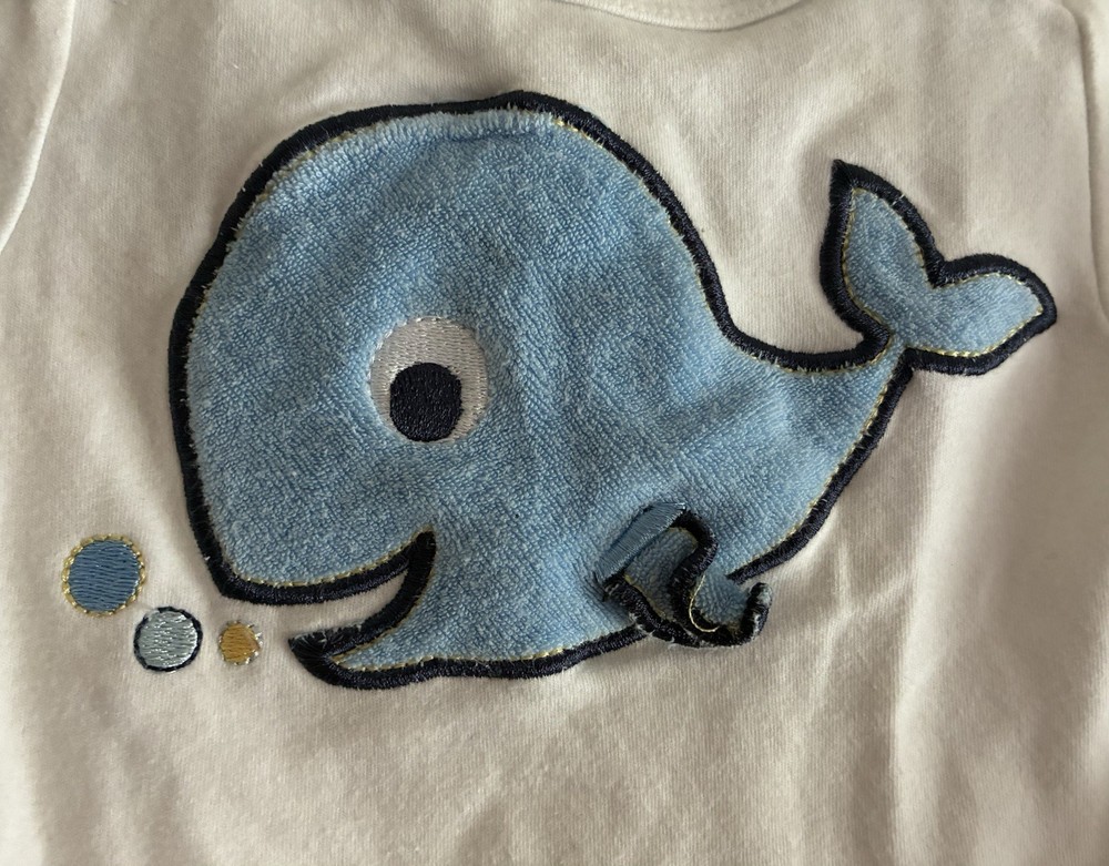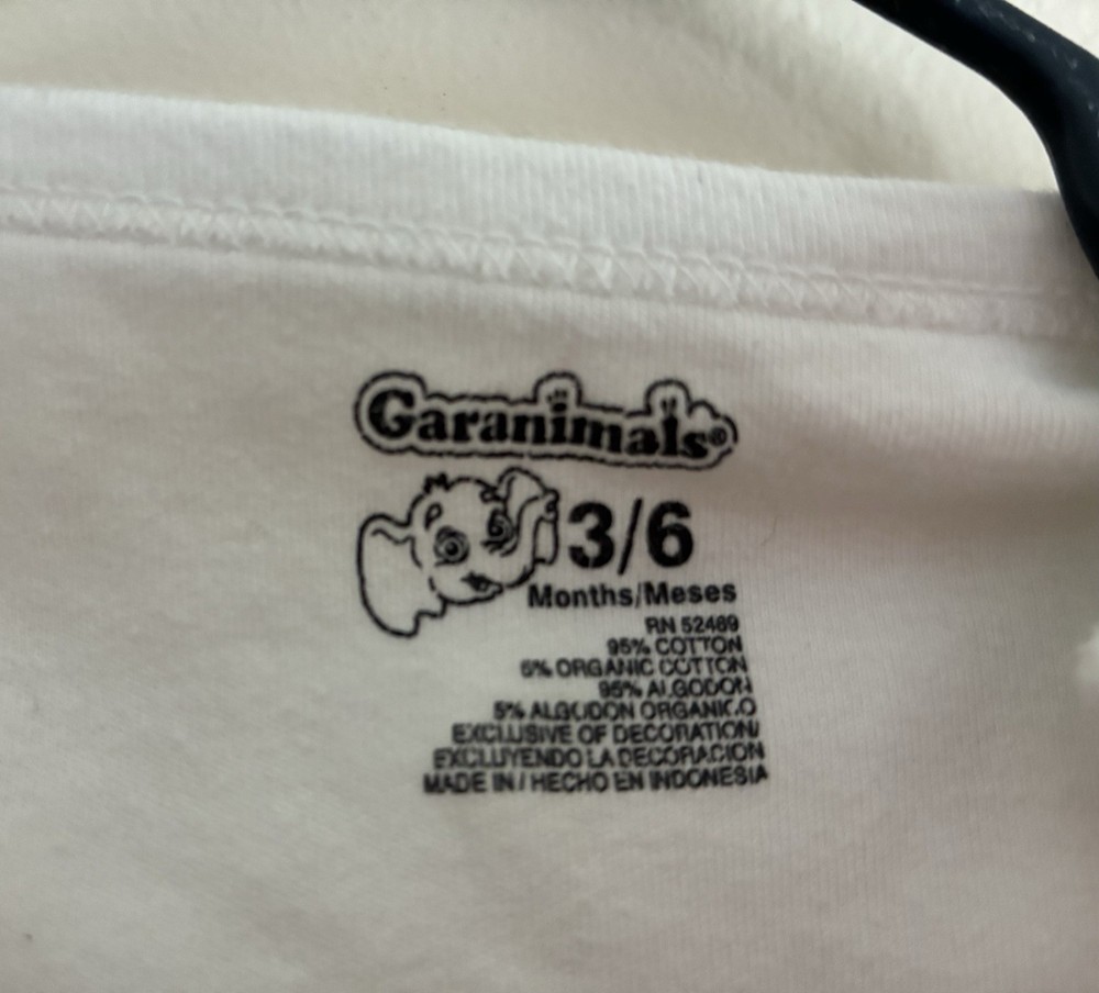 Accents: Embroidered Department: Boys Pattern: Solid Occasion: Casual Style: Bodysuit Theme: Animals, Sea Life, Whale Garment Care: Machine Washable Material: 95% cotton, 5% organic cotton Seller Notes: “In very good condition. Free of rips or stains.” Character: Boy Sleeve Length: Short Sleeve Season: Fall, Spring, Summer Type: One-Piece Closure: Snap Size: 3-6 Months Color: White Neckline: Crew Neck Number of Pieces: 1 Piece Features: Comfort, Easy Care, Lightweight, Stretch Brand: Garanimals Country of Origin: Indonesia Set Includes: Bodysuit