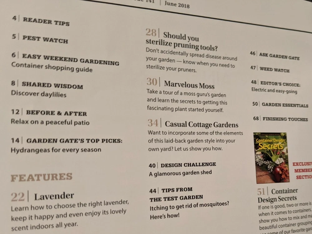 This listing is the June, 2018 issue of Garden Gate magazine in very good condition. This is a members' edition of the magazine. Featured are: Container Design Secrets Guide To Summer Color Adding Cottag e Charm To Any Garden Bird-Friendly Backyard Makeover ...and much more!