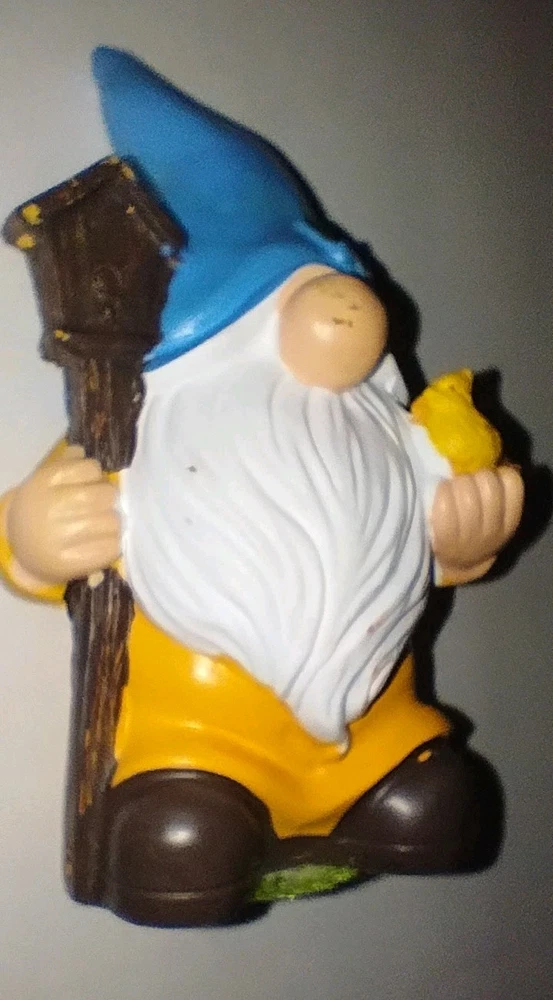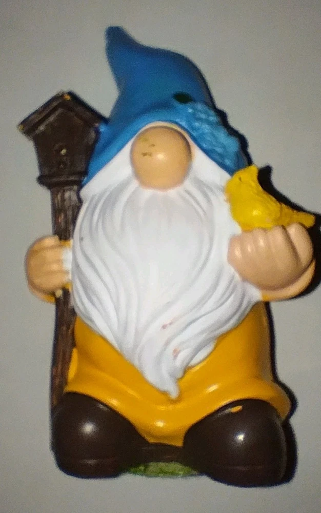 This is a small Garden Gnome made of handcrafted resin, featuring a GARDEN GNOME character with a multicolor Art Deco style. It is designed for both indoor and outdoor use, with a height of 5.25 inches and a width of 3 inches. The gnome is handpainted and themed around Birds & Birdhouses, making it a whimsical and colorful addition to any garden or home decor.