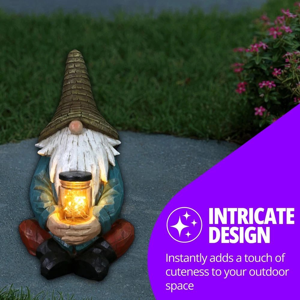 GARDEN GNOME SCULPTURE: Add a touch of whimsical charm to your home garden decor with the Roof Hat Garden Gnome Statuary; featuring meticulous artisan craftmanship and lovingly hand painted, this enchanting and adorable gnome statue features a cute roof style hat and an LED powered glass jar, perfect for adding magical decoration and soothing accent lighting to your home garden, lawn, yard, patio, or front porch area EVERLASTING GLOW: Our garden statues feature a glass jar powered with 8 energy-efficient solar LED fairy string lights, which provide breathtaking illumination as the sun sets and dusk settles in; our garden figurines automatically light up at dusk and are great for adding beautiful accent lighting to your garden plants, patio, porch, yard or path way area **Requires 24 hours of direct sunlight upon first installation** BUILT TO LAST: Our decorative gnome sculptures are constructed with durable resin material to stand up to all of the weather seasons, and the garden gnome figures are UV treated to resist fading, ensuring that these statuaries are built for years of enjoyment GARDEN GIFTS: A garden gift is a great way to introduce someone to the joys of gardening. Garden art is a personal and thoughtful way to show that you care, and yard art makes a superb birthday gift, wedding gift, or office gift idea. Lawn ornaments make great gifts for gardeners who have everything or to keep and cherish for yourself HAPPY HOMES SMILING GARDENS: is a family owned and operated USA based business with over 30 years of experience producing craftsman quality garden art. has become an industry leader by building relationships with people one garden (gnome) at a time. Our passion is to make every garden a work of art