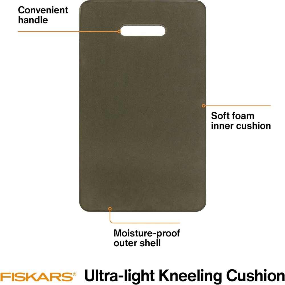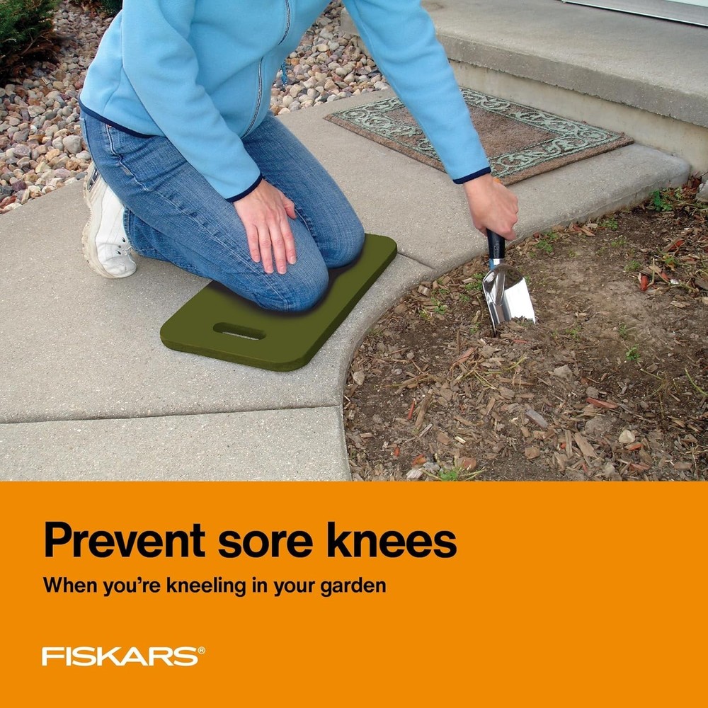 Fiskars Garden Kneeling Pad, 11" x 18" Lightweight and Thick EVA Foam Knee Cushion with Handle for Gardening, Cleaning, or Construction - Moisture and Rip Resistant, Gardening Supplies, Green Brand Fiskars Special Feature Lightweight Color Green Size 1 Count (Pack of 1) Fill Material Foam About this item A long-lasting, easy-on-the-knees foam cushion great for gardening, cleaning, and construction project Resilient EVA foam won't absorb moisture and resists rips and abrasion Convenient carrying handle The durable EVA foam that protects knees from hard, rough, cold or damp surfaces. Measures 11-inches wide by 18-inches long by 3/4-inch thick Product Description Product Description The Fiskars Large Ultra Light Kneeling Cushion is a light, tough, resilient cushion and a perfect example of how Fiskars puts more thought, more quality and more performance into every item they offer. While most foam cushions collapse with little use and soak up water like a sponge, Fiskars uses durable EVA foam that protects knees from hard, rough, cold or damp surfaces. Plus, it won't absorb moisture, resists rips and withstands abrasions for seasons of comfortable use. Ideal for gardening, it's also handy for refinishing floors, cleaning out the fireplace, organizing under the kitchen sink, and any other job that brings you to your knees. Sized at 11 inches wide by 18 inches long by 3/4-inch thick, This Garden Kneeling Pad fits handily in a garden tool caddy or hangs neatly on the wall via the convenient carrying handle. Designed to help you transform the backyard, Fiskars lawn and gardening tools are equipped with smart technologies and award-winning, ergonomic features that make it easier and more enjoyable to perform your own lawn care. From pruning shears, lawn mowers, weeding tools, and tree cutters, we take a holistic approach to develop garden equipment that reflects hours of immersive study, research, and validation, resulting in gardening supplies that outperform the competition and feel like a natural extension of your body.