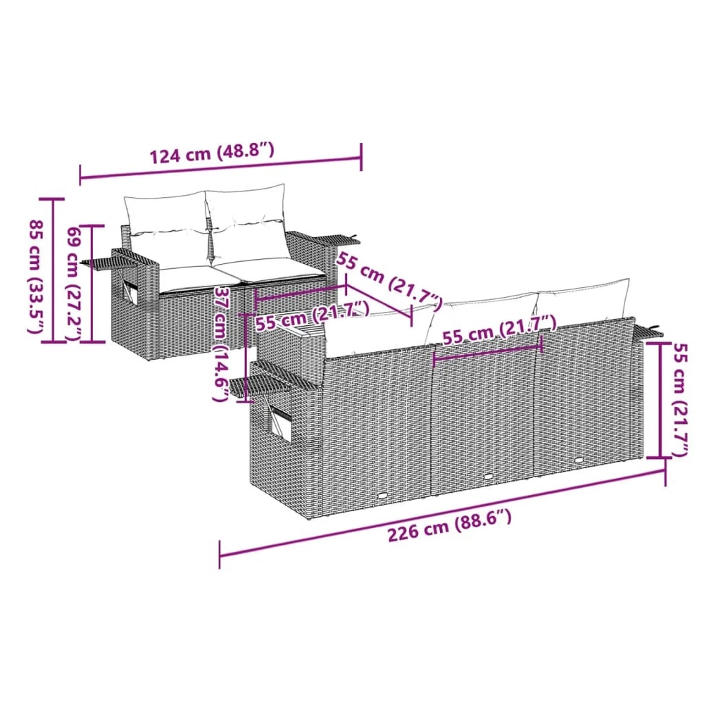 Size: 6 Piece This 6 Piece Modular Garden Sofa Set blends style and practicality, making it a must-have for any outdoor area. Made from sturdy poly rattan and solid acacia wood, it looks great while providing comfort, perfect for patios, gardens, or balconies, creating a welcoming environment for relaxing or hosting. The sofa set's modular design lets you rearrange the pieces to suit your space, making it flexible for different occasions. Each seat cushion is plush and soft, covered in weather-resistant fabric to keep you comfy during long lounging sessions-ideal for outdoor relaxation. Built with UV-resistant materials, this sofa set stands up to the elements, stopping fading and wear, so you can enjoy your furniture for ages. The cushion covers zip off easily for cleaning, which makes it simple to keep your sofa looking its best. With a maximum seating capacity of 6, it's perfect for both intimate gatherings and big get-togethers, really enhancing how you use your outdoor spaces. Color: Black Shape: Rectangular Material: Synthetic Poly Rattan Finish: Oiled Indoor/Outdoor: Indoor / Outdoor Cover Included: No Room: Garden and terrace Capacity: Max load per seat: 242.5 lbs Maximum Number of People: 6 Maximum Weit: 242.5 lbs Dimensions: 21.7 x 21.7 x 14.6 in (W x L x H) Surface Height: 1 in Seat Depth: 21.7 in Seating Capacity: 5 Swings: No Delivery Contains: 1 x Centre seat, 4 x Arm sofas, 1 x Garden table, 5 x Back cushions, 5 x Seat cushions with removable and washable covers Assembly Required: Yes Recommended Number of People for Assembly: 2
