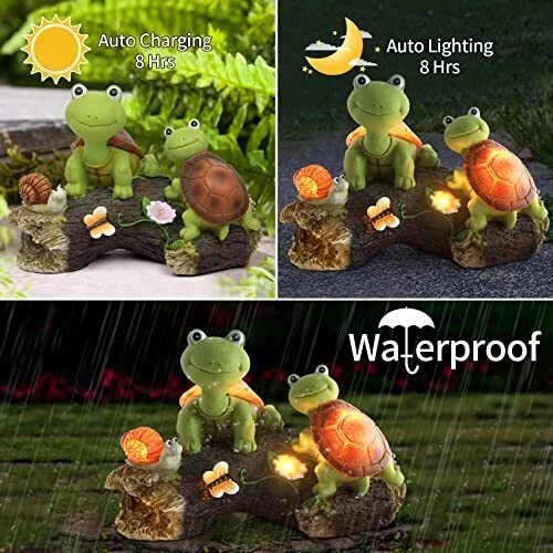 Menu 1. We require immediate payment. 2. We currently accept payment via eBay managed payments only. 3. Once payment is cleared, we will dispatch your shipment within 1-3 business days. Please refer to the "Shipping" tab for more information regarding shipping speed to your destination. Garden Statue Outdoor Decor-Cute Frog Face Turtles with Solar Lights Outdoor Lawn Decor Garden Tortoise Statue for Patio, Balcony, Yard, Lawn Ornament,Gardening Gifts for Mom Product description Solar Garden Statue - Illuminate your outdoor space at night with this adorable smiling frog-face turtles statue featuring light-up turtle & snail shell and flower that emits a warm atmosp to your garden. Great Addition To Garden - This adorable outdoor statue is a wonderful addition to your backyard or garden. Plant this turtle statue in the garden, backyard, lawn, patio, fences, walkways, or anyw you like, let the warm light can brighten up your outdoor space. Easy To Use - Simply press the bottom button, and leave the Turtle Figurine in the “on” position during the daytime. The solar panel will charge during daylight hours and light up automatically at night. The LED lights will fully charge within 6-8 hours and will light up for 8-10 hours. Gift Giving Choice - A Great Garden Gift -This charming solar garden statue can be a perfect gift choice for who you loved Mom, Grandma, Wife, Daughter,child's birthday, mother's birthday, Mother's Day, Father's Day, Thanksgiving Day, Valentine's Day, and Christmas. Perfect After-Sales Service - Your satisfaction experience is our priority, if you have any issues with our garden sculptures, please feel free to contact us, and we will give you a satisfactory solution. PLEASE MESSAGE US IF YOU HAVE ANY OTHER QUESTIONS, AND MANY THANKS FOR READING ALL OF THIS. Copyright ©#. All Rights Reserved.