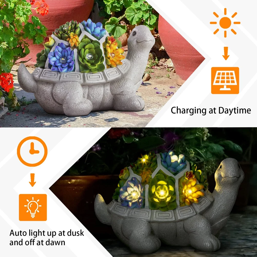 Turtle Garden Statue - Turtle resin statue with solar-powered lights and adorned with flower ornaments, it feels like a really cute smile turtle living in the garden. It adds more energy and color to your house Solar Powered - This decorative outdoor figurines with 7 warm white LED lights and fully powered by the sun. If fully charged during the day, it can work for more than 8 hours at night Weather Resistance - This turtle figurines made of resin material, hand-painted and finished with a UV resistant coating can withstand all type Weather. Product Size: 8.7 "L x 5 "W x 6 "H, Weight: 0.6kg Easy To Use - Always keep the turtle solar statue's switch "ON" during charging, make sure the solar panel can receive at least 8 hours full and direct sunshine each day Great Garden Decor - Whether you are looking for solar light, patio decor or turtle collection, this solar lawn ornament will be your best choice