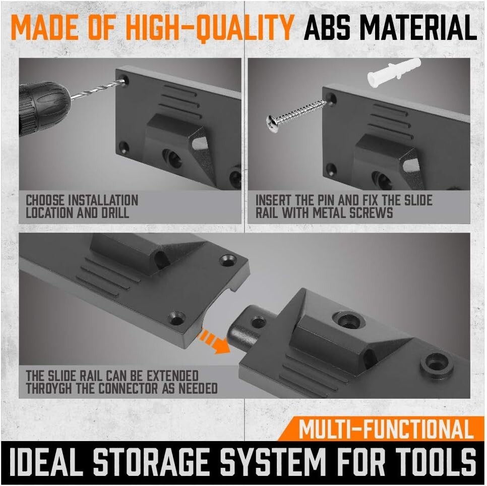 1. The Adjustable Storage System is made of high-quality heavy-duty ABS material, ensuring excellent quality and durability. 2. Each storage unit is 16 inches long, or a total of 4 rails, up to 64 inches, providing ample storage space. 3. Each hook comes with a non-slip vinyl covering prong for better fixing tools, making it easier to grasp objects and protect the surface of the goods from scratches. 4. The hook is made of high-quality aluminum-plastic material, plus a strong PVC non-slip coating, which makes it easier to grasp objects and protect the surface of the goods from scratches. 5. Each hook of the tool organizer can bear the weight up to 15LBS(7KG), and each peg can bear the weight 5.5LBS(2.5KG), ensuring that your garage or garden tools won't fall out.