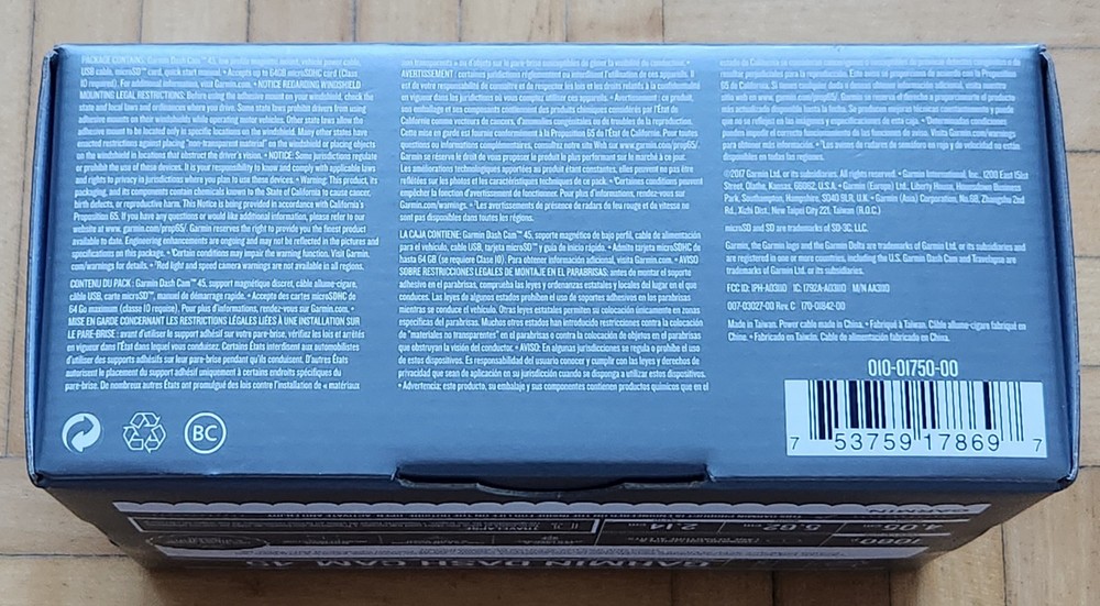 Manufacturer Part Number:010-01750-00Number of Cameras:1Country of Origin:TaiwanRecording Resolution:1080 pBrand:GarminColor:BlackFeatures:Compact and Discreet, GPS-enabled Dash Cam, Records High-quality 1080p Video, Wirelessly syncs videos to smartphone, Drive with Increased awarenessModel:010-01750-00