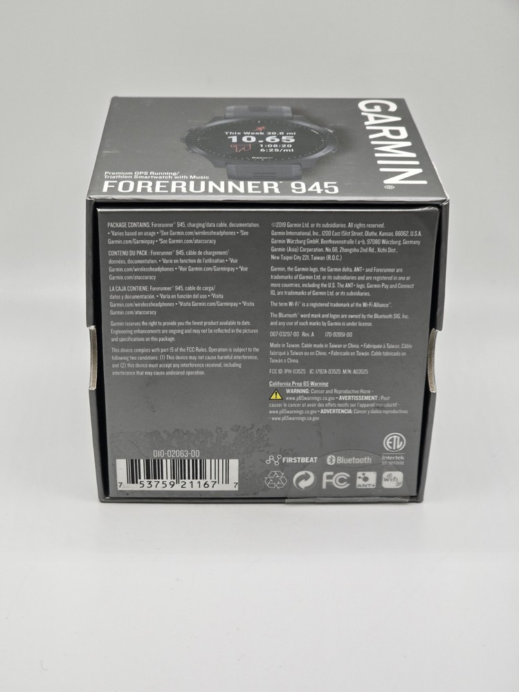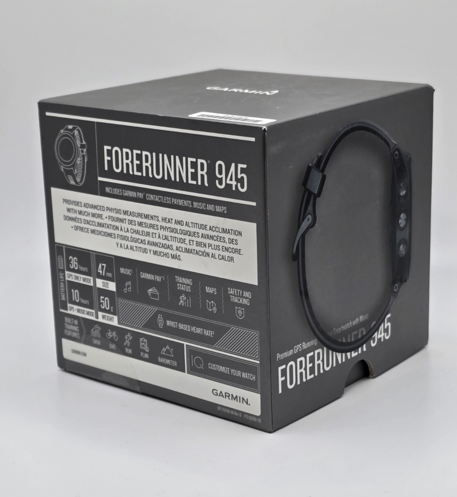 gtin13:0753759211677Model:Garmin Forerunner 945Brand:GarminMPN:010-02063-00UPC:0753759211677Type:SmartwatchSport/Activity:Swimming, Running & JoggingFeatures:Timer, Rechargeable Battery, Distance Traveled, Speedometer, Alarm, Stopwatch, GPS, Calorie MonitorSeller Notes:“Costumer return, looks open box, powers on but not tested, what you see is included.”Color:Black