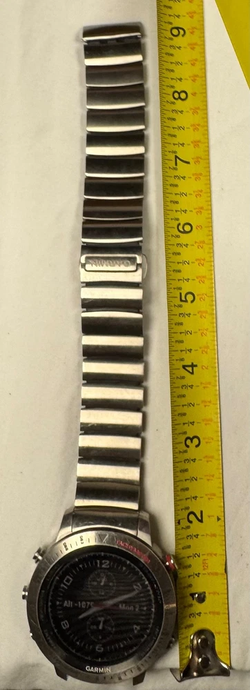 I am the original owner and used it lightly but it’s been well maintained and operates perfectly. This is the titanium version (indicated by red vs black start/stop button and single link band vs woven stainless steel band). Originally the titanium version sold for $1499 vs the stainless ($1000) and leather band with stainless housing ($900). The titanium version is substantially lighter than the stainless (103g vs stainless at 184g). Includes original box, titanium band, alternative black silicone band and brand new charger. The Garmin fēnix Chronos Titanium is a premium, rugged multisport watch featuring a lightweight, jeweler’s-grade titanium housing and band. It combines advanced GPS/GLONASS navigation, heart rate monitoring, and Sapphire lens durability with a sophisticated aesthetic, boasting a 1.2-inch color display and 100-meter water resistance. On the back of the case there is some wear relating to the removal of some engraving but this is cosmetic only and can’t be seen when the watch is worn.