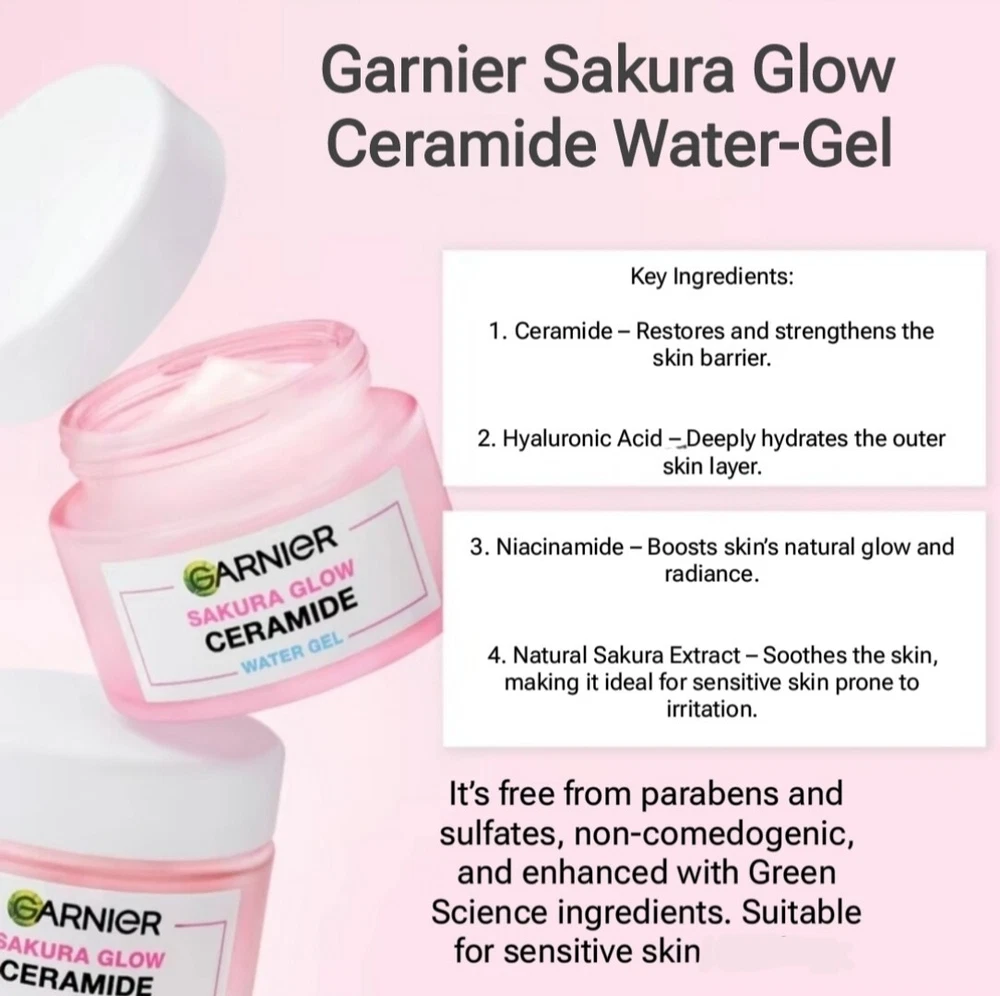 Garnier Sakura Glow Ceramide Water-Gel Restores radiance glow Skin. Condition: New, 100% Autentic Quantity: 2 Boxs. Size: 50 ml. Garnier Sakura Glow Ceramide Water-Gel is a lightweight gel that provides intense hydration, increasing moisture by up to 108%* to help restore the skin's barrier for a healthier, radiant appearance. It’s free from parabens and sulfates, non-comedogenic, and enhanced with Green Science ingredients. Suitable for sensitive skin, it offers: 🎯Key Ingredients: 1. Ceramide – Restores and strengthens the skin barrier. 2. Hyaluronic Acid – Deeply hydrates the outer skin layer. 3. Niacinamide – Boosts skin’s natural glow and radiance. 4. Natural Sakura Extract – Soothes the skin, making it ideal for sensitive skin prone to irritation. This product was tested and certified by MS Clinical Research with 36 volunteers in August 2023. Usage: Apply evenly to the face and neck after cleansing. Avoid the delicate area around the eyes. 🎯Ingredients✅ AQUA_/ WATER, GLYCERIN, ALCOHOL DENAT. NIACINAMIDE,DIMETHICONE, ISONONYL ISONONANOATE, CERAMIDE_NP. CARBOMER, DIMETHICONOL PARFUM_/ FRAGRANCE, SODIUM HYDROXIDE SALICYLIC ACID, SODIUM HYALURONATE PHENOXYETHANOL, PRUNUS LANNESIANA FLOWER EXTRACT, CHLORPHENESIN, TOCOPHERYL_ACETATE, LIMONENE, CAPRYLYL GLYCOL CAPRYLOYL SALICYLIC ACID. TETRASODIUM GLUTAMATE DIACETATE CITRONELLOL, BIOSACCHARIDE GUM-1, XANTHAN GUM, MENTHOXYPROPANEDIOL PSEUDOALTEROMONAS FERMENT EXTRACT. BUTYLENE_ GLYCOL, HEXYL CINNAMAL.(F.I.L Z70043440/1). ✈️All orders will be sent by Post Thailand with a tracking number. It usually takes around 11-23 Business days worldwide with a tracking service. 😊Please Feel Free to Contact us. We will be happy to help you. 😊Feedbacks Kindly Leave us a Positive Feedback if you are Happy with the product. 🫡If there is any kind of dis satisfaction. Please let me Know , i will surely solve the Issue. Thank for visiting and shopping with us🙏🙏🙏
