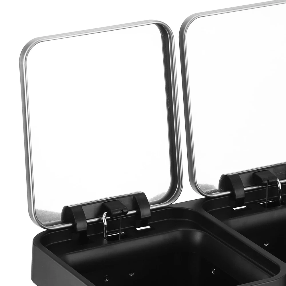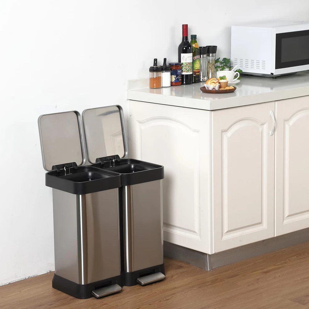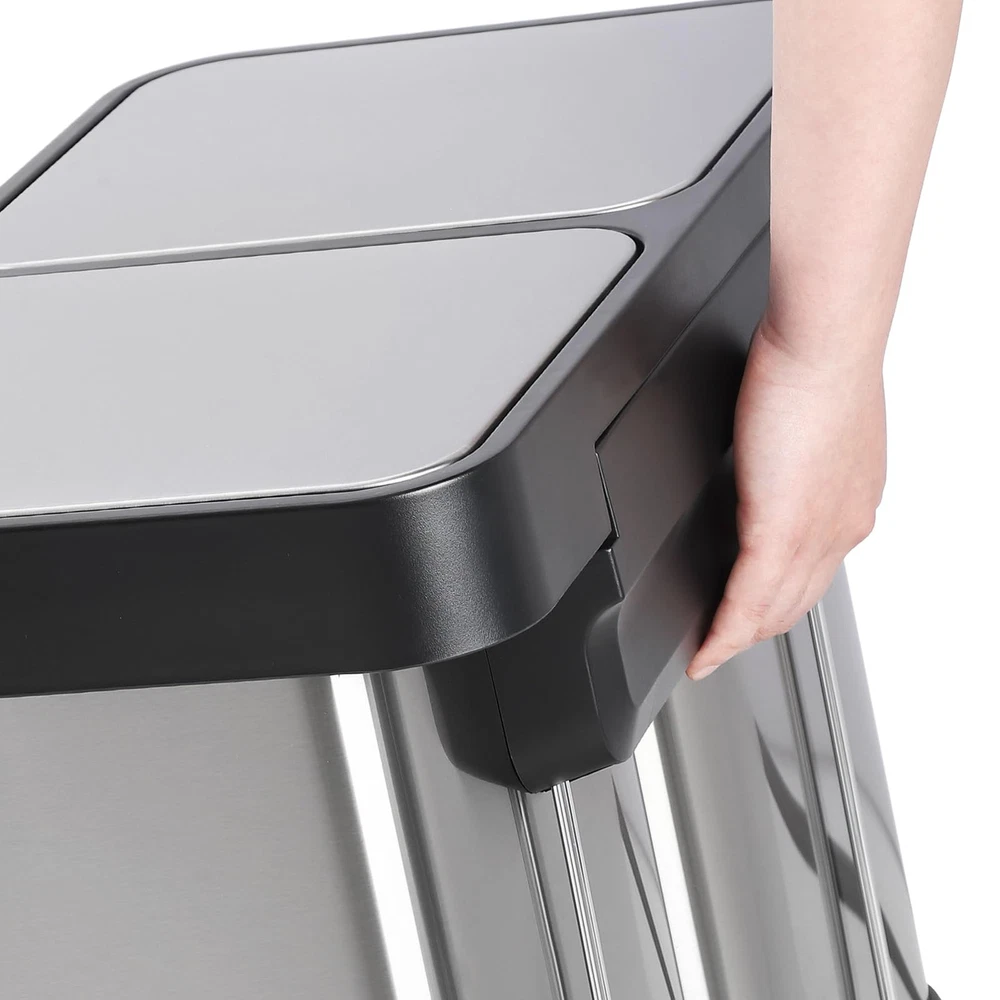 Step-Open Trash Can with Soft-Close Lid, Modern, Minimalistic for Home, Kitchen, Laundry Room, Office, Bedroom, Bathroom, with Inner Bucket Silent and Smooth Closure: The dual trash and recycling bins feature a soft-close lid mechanism that ensures quiet and gentle closure, creating a peaceful environment. The internal hinge design prevents lid slamming noise, minimizing disturbances and providing a pleasant user experience with its silent operation. The smooth closure adds a touch of convenience while maintaining a tranquil atmosphere in the kitchen or any space where the bins are used. Enhanced Kitchen Hygiene: Constructed from durable stainless steel, the recycling bin is resistant to fingerprints and dirt, making it easier to maintain a clean and hygienic kitchen environment. The bottom seals of the bins further prevent spills and leaks, contributing to a tidier and odor-free kitchen space. This improved hygiene helps create a healthier and more welcoming atmosphere in the kitchen, promoting cleanliness and sanitation. Hands-Free Operation Convenience: Each compartment of the garbage can features a sturdy steel pedal for convenient and hygienic hands-free operation. This hands-free operation is especially useful in the kitchen when hands are full or messy, allowing for easy waste disposal without the need to touch the bins. The hands-free design adds a level of convenience to daily waste management tasks, simplifying the process and promoting cleanliness. Efficient Space Utilization: Despite offering dual compartment functionality, the dual trash and recycling bins are designed with a space-saving layout that conserves space in small kitchens or homes with limited storage. The separate compartments for waste disposal and recycling maximize efficiency and convenience, providing a practical solution for households of all sizes. The compact design ensures that the bins can be easily integrated into various spaces without occupying excess room. Dual Compartment Recycling Convenience: The garbage can with a lid is thoughtfully designed with two separate compartments for easy waste sorting and recycling. This dual compartment feature simplifies waste management and encourages recycling practices in the home by providing a convenient way to separate and dispose of recyclable materials responsibly.