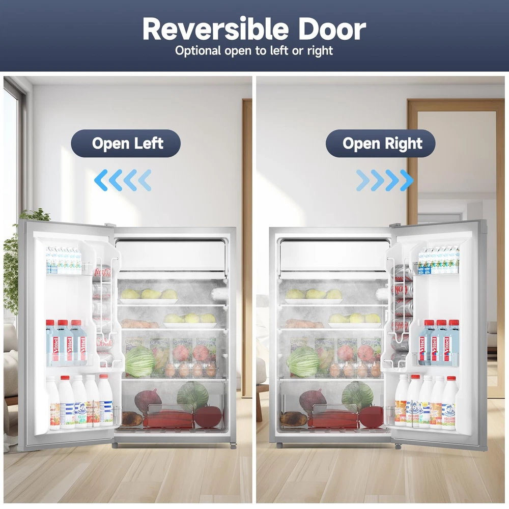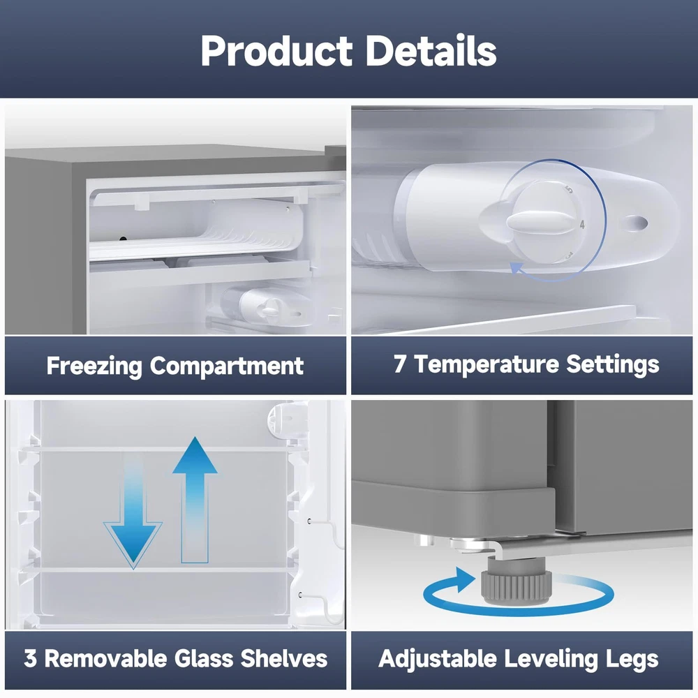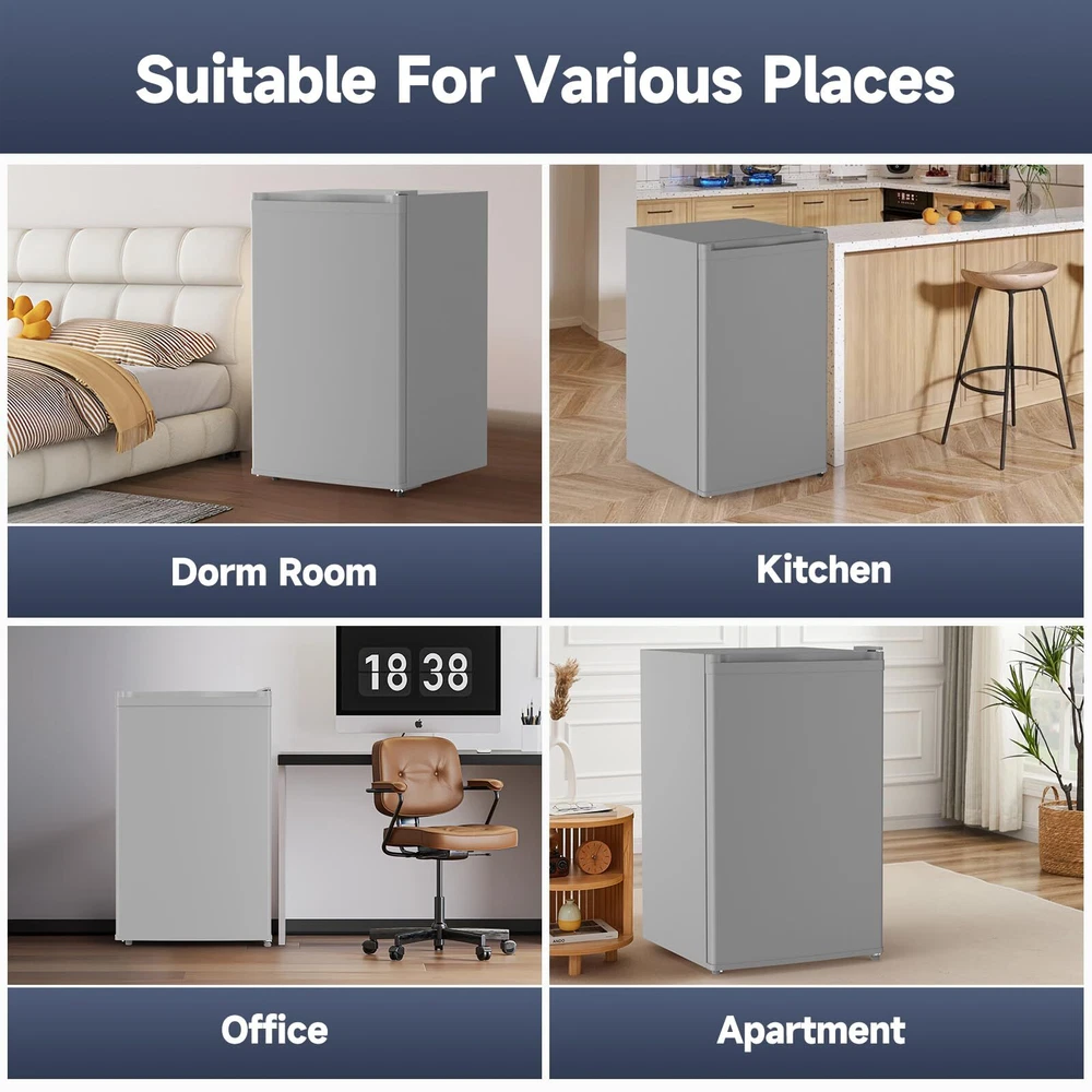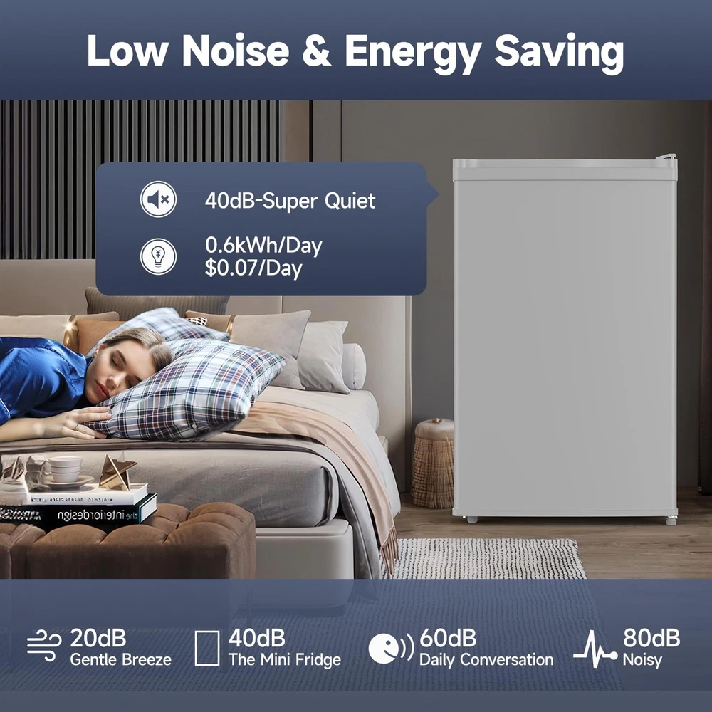 【Single-Door】This 4.3 Cu.Ft mini fridge is a combination of 0.4 Cu.Ft freezer and 3.88 Cu.Ft refrigeration. The single door design is easy to access items such as ice and beverages. With a high utilization of storage space and takes up little space, this fridge is perfect for use in dormitories, offices, bedrooms, dorms. 【Adjustable Thermostat】This refrigerator has an adjustable thermostat with 7 variable temperature settings from 32°F to 50°F, manually adjusted as needed to keep your food and beverages at the optimal temperature. The temperature of the freezer is affected by the temperature setting of the cooler. And the freezer can store ice cream and ice cubes, so you can enjoy a cold one during the hot days. 【Energy Efficient & Low Noise】The compact refrigerator costs energy as low as 0.6 kWh per day. And this mini fridge for office operates at a very low 40dB, so it won't interfere with your rest. As our dorm fridge is energy efficient and quiet, you'll hardly notice it's there as it cools your food and drinks, making it the ideal appliance for bedrooms, dens and other quiet spaces. 【Organized Storage】This mini fridge for bedroom has a crisper drawer to keep fruits and vegetables fresh and juicy. The storage space of the small fridge can be adjusted with 3 removable shelves to meet actual storage needs. You can easily organize your fruits, vegetables and beverages for easy access. Refrigerator size: 20.63in x 20.63in x 32.71in. 【Practical Compact Fridge】This mini fridge with freezer features a sleek exterior that not only looks great in any setting, but also has practical features, complete with a freezer compartment for storing ice cream and frozen foods. This small refrigerator is perfect for those who want to add convenience without losing their sense of style.