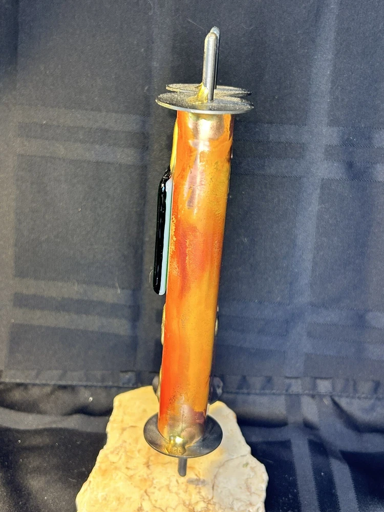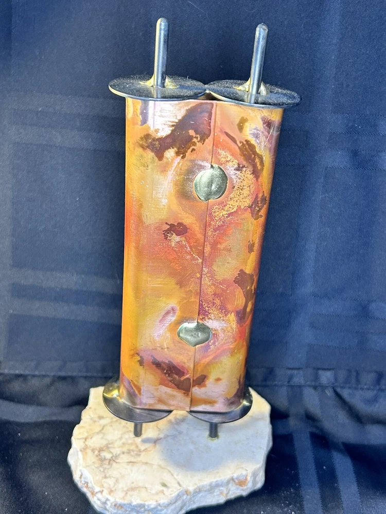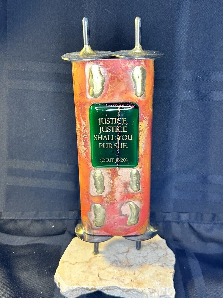 Gary Rosenthal Combines Copper, Steel, Brass And Fused Glass To Create This Sculptural Display Torah Sitting On A Marble Base. The Fused Glass Front Screened With "Justice, Justice, Shall You Pursue," Makes This A Wonderful Gift For Your Favorite Attorney, Judge or Anyone who seeks out Justice in Our World! The Torah Is 9" High X 3" Wide X 3" Long. This Sculpture is Hand Signed on the Bottom G.R. '08 Making it a rare item since he only signed the items he actually made personally.