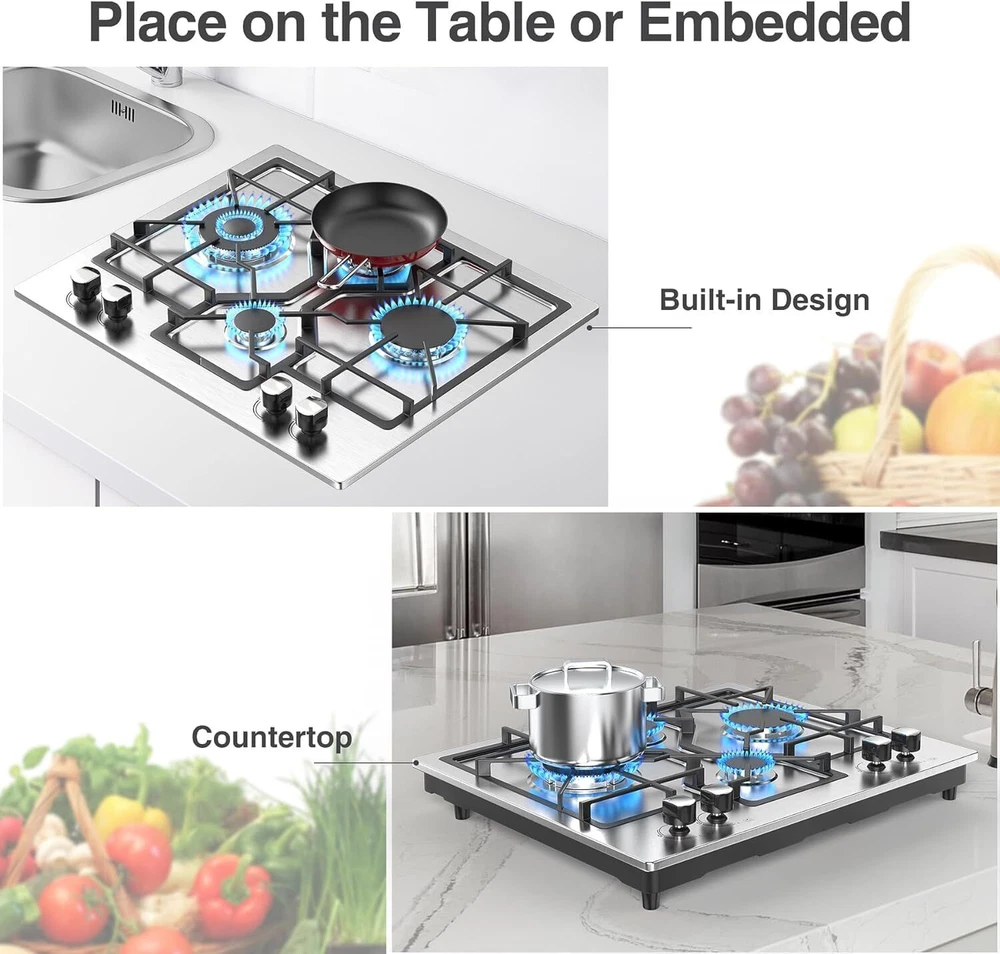 Discover Culinary Mastery with the 4-Burner Gas Cooktop: Unleash the power of precision cooking with our 4-burner gas cooktop, boasting a total power of 30000 BTU (11000BTU+9500BTU+6000BTU+3000BTU). Crafted for culinary enthusiasts, this appliance features 4 metal control knobs for meticulous adjustments, including a large burner with inner and outer flame rings for even heat distribution. Premium Build for Exceptional Performance: Designed with durability in mind, the surface of this propane gas burner is made of heat-resistant, corrosion-resistant stainless steel. The heavy-duty cast iron grate ensures stability, withstanding the rigors of daily use without deformation. Safety & Convenience Redefined: Prioritize safety with our dual-fuel gas stove, equipped with a thermocouple flame failure system (FFD) that automatically shuts off the gas when no flame is detected. Specifically designed for both NG and LNG, the default setting suits natural gas, and an additional LPG nozzle is included for versatility. The 110-120V AC power plug, coupled with automatic electric pulse ignition, guarantees faster and more stable performance. Versatile Placement Options: With dimensions of 23.23" x 20.08" x 2.76", and built-in dimensions of 22.04" x 18.89", this gas cooker seamlessly fits into various spaces, from RVs to kitchens and apartments. Ensure the size aligns with your needs for optimal use. Choose for Reliability: Opt for the trusted brand, , and experience unparalleled service. We stand by our commitment to providing the best service, backed by a one-year warranty and 24/7 after-sales support. Important Notices: After successful installation, conduct a leak test and ensure use in a well-ventilated place. Avoid using on wooden tables or tabletops covered with tablecloths to prevent high heat and spontaneous combustion. Elevate your cooking experience with the 4-Burner Gas Cooktop – where precision meets safety and durability. [ 4 High-Efficiency Gas Burners ]: This gas cooktop 4 burners has a total power of 30000 BTU (11000BTU+9500BTU+6000BTU+3000BTU). It is equipped with 4 metal control knobs for precise adjustment. One of the large burners has inner and outer flame rings for more even heat distribution. You can use it to fry, simmer, steam, boil, and melt all kinds of food simultaneously for the ultimate culinary ! [ High Quality Materials ]: The surface of this propane gas burner is made of stainless steel, which is heat-resistant, corrosion-resistant, and easy to clean. The stovetop is equipped with a heavy-duty cast iron grate, which is ultra-sturdy and will not deform. [ Safety & Convenience ]: This dual-fuel gas stove is equipped with a thermocouple flame failure system (FFD), which will automatically shut off the gas when no flame is detected, avoiding gas leakage and ensuring the safety of you and your family. It is specially designed for NG and LNG, the default setting is suitable for natural gas, and the accessory contains an additional LPG nozzle. Using a 110-120V AC power plug, automatic electric pulse ignition is faster and more stable. [ Use It Anywhere ]: Dimensions of this built-in gas cooker: 23.23" x 20.08" x 2.76". Built-in dimensions: 22.04" x 18.89". Perfect for RV, kitchen, and apartment. Make sure this gas stove is the right size for you. [ Choose Us ]: Choose to trust , we promise to provide you with the best service, a one-year and provide 24/7 after-sales service. [ Notice ]: Please do a leak test after successful installation, it should be used in a ventilated place. Do not use on wooden tables or tabletops covered with tablecloths as this will result in high heat and spontaneous combustion.