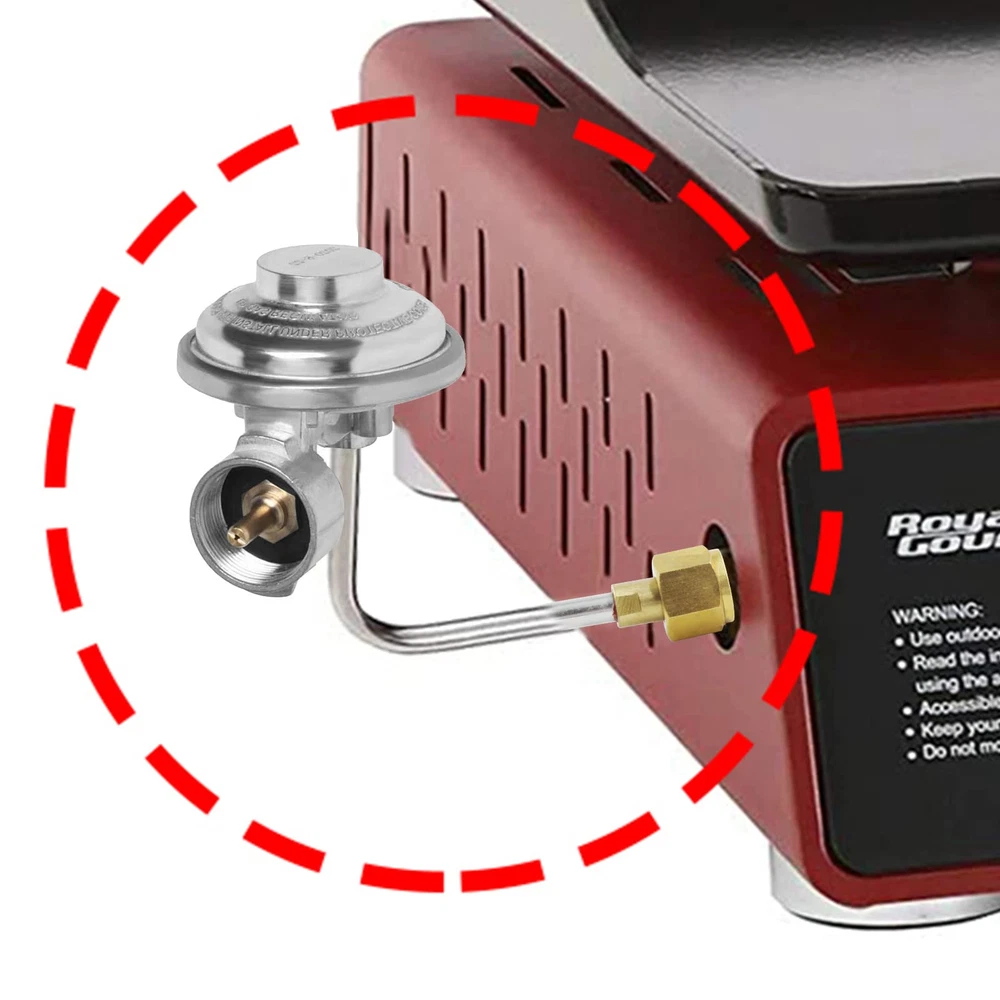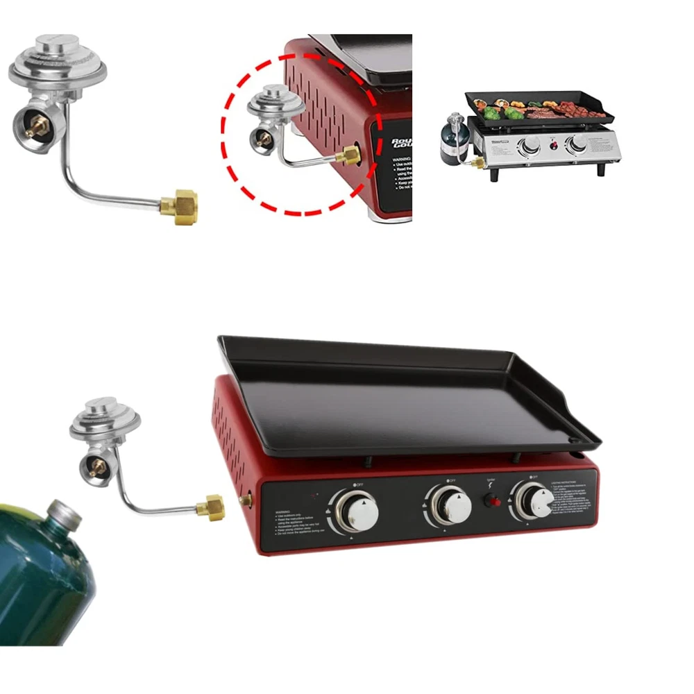 👍Replaces portbale 1lb gas griddle regulator for outdoor cooking camping or tailgating ,black/ red royal PD 1301S protable 24 inch 3 burner table top gas grill griddle and pit boss grill 75275 stainless steel burner protable grill etc 👍 Lp gas regulator inlet is 1”X 20 female throwaway cylinder thread, use to connect 16.4 oz prop bottle ,The outlet is 3/8" (5/8"-18 UNF) female flare fitting use for connect to bbq grill. outdoor heater . fire pit table etc has 3/8 male flare thread adapter. 👍Gas flow: 25000BTU/hr, outlet pressure:11"W.C, gas regulator allows a certain amount of fuel to the griddle, further ensures a stable and secure gas pressure during cooking. 👍Gas grill regulator can be with QCC1.POL propane hose adapter connected to 5lb-40 lb propane tank cylinder use 👍Made of high quality stainless steel and brass, which provides greater durability.Easy to install, no tools are required to replace this item.Allows you to amplify the quality of your camping or traveling experiences