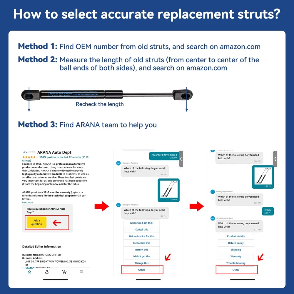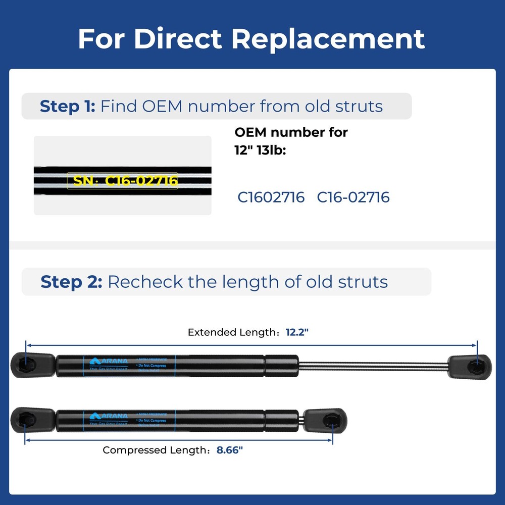 C16-02716 12 inch 15 Lb/58N Gas Struts Spring Shocks C1602716 12 inch 15Lb Lift Support for Pickup Truck Aluminum Toolbox, Weatherguard Toolbox, are Leer Camper Shell Window, Set of 2 Interchange Part Number: C1602716; C16-02716 12 inch 15lb Gas Struts -- Extended Length (Center-to-Center): 12.20" (310 mm); Compressed Length (Center-to-Center): 8.66" (220 mm); Force: 15 Lbs (58 N) Per Strut, 2 Struts per set, not 1 C16-02716 12 inch Gas Spring -- C16-02716 struts could be used as the replacement parts for pickup truck aluminum toolbox, weatherguard toolbox, ARE leer camper shell window and other light DIY Builds, etc 12 inch 15lb Gas Prop Struts -- Please confirm the Interchange Number of your old sturts if you use the struts as the replacement, and re-check the length before purchasing to avoid buy wrongly 12 inch 15 lb Gas Shocks -- Most suitable support weight is between 10-15 pounds if using for DIY builds; Note: the struts could only be compressed after installing successfully 18 Months Support-- If any questions or dissatisfactions before/after purchasing or need installing/using guide, please message directly to let us provide in-time assistance to you C16-02716 12 inch 15 Lb/58N Gas Struts Spring Shocks C1602716 12 inch 15Lb Lift Support for Pickup Truck Aluminum Toolbox, Weatherguard Toolbox, ARE Leer Camper Shell Window, Set of 2 Shipping We offer FREE shipping on all orders! We ship within Three business days of payment, usually sooner. We use a selection of shipping services such as UPS, FedEx, USPS etc. We only ship to the lower 48 states, no APO/FPO addresses or PO Boxes allowed. Local pickups and combined shipping options are not provided at this time. Return You can return a product for up to 30 days from the date you purchased it. Any product you return must be in the same condition you received it and in the original packaging. Please keep the receipt. Payment We accept payment by any of the following methods: PayPal Please pay as soon as possible after winning an auction, as that will allow us to post your item to you sooner! Feedback Customer satisfaction is very important to us. If you have any problem with your order, please contact us and we will do our best to make you satisfied. Contact Us If you have any queries, please contact us via ebay. We usually respond within 24 hours on weekdays. Please visit our eBay store to check out other items for sale! Thank you for shopping at our store.