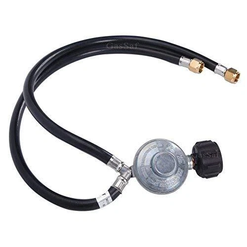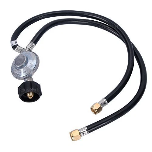 Our GASSAF regulator with this two hoses and you can connect two propane equipments,great for use with low pressure gas applications Fits QCC1/Type1 tank connections and end connector -5/8 inchs outside diameter, 3/8 inchs female flare swivel nut Long lasting high Quality Material - Provides secure, air-tight connection between grill or fire pit and tank Regulator/hose for use on gas grills, heaters, lanterns, camp stoves, tabletop grills, fire pit table and more Great for BBQ, camping, tailgating, heating needs or having an outdoor cookout