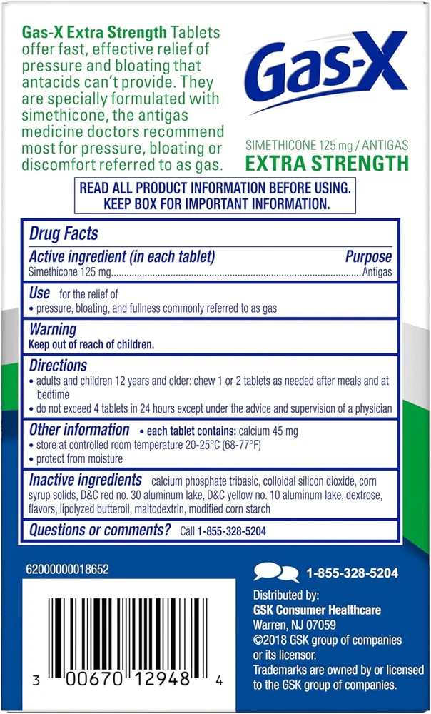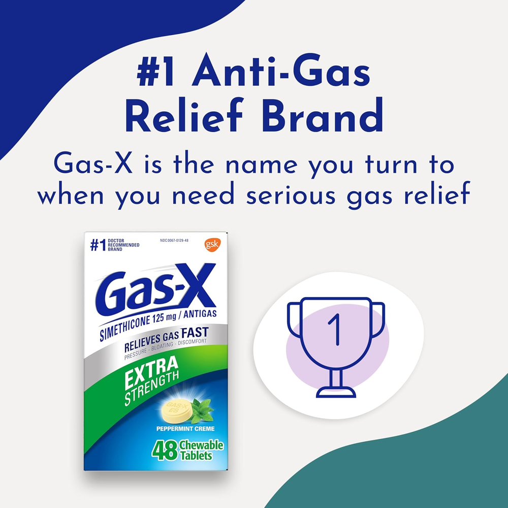 Store New Arrivals Add to Favorite View Feedback Contact Gas-X Extra Strength Chewable Gas Relief Tablets with Simethicone 125 Mg, Peppermint Creme - 48 Count Description Item model number 44069875 Item dimensions L x W x H 1.22 x 2.76 x 4.13 inches Product Dimensions 1.22 x 2.76 x 4.13 inches; 2.22 ounces Special Feature Fast-Acting Brand Gas-X Product Benefits Gas Relief Flavor Name Peppermint Manufacturer Haleon US Services Inc. Is Discontinued By Manufacturer No Specific Uses For Product Gas Relief Size 48 Count (Pack of 1) One 48 count package of peppermint creme flavored Gas-X Extra Strength Chewable Gas Relief Tablets with Simethicone 125 mg; number 1 Anti-Gas Relief Brand Gas-X simethicone gas relief tablets provide fast gas and bloating relief Gas-X antigas chewable simethicone tablets go to work in minutes to provide bloating and gas relief, rescuing you from embarrassing situations and helping you get back to feeling like yourself Contains 125 mg of simethicone for fast gas relief Simethicone extra strength gas relief tablets are easy to take and come in delicious peppermint creme flavor Gas-X is the number 1 doctor recommended OTC anti-gas product* Adults and children 12 years of age and older may chew one or two gas relief chewable tablets as needed, not to exceed four tablets in 24 hours Gas-X is the name you turn to when you need serious gas relief HSA and FSA eligible product From the number 1 Anti-Gas Relief Brand comes Gas-X Extra Strength Gas Relief Softgels with Simethicone 125 mg deliver fast relief of gas pressure, bloating and discomfort. These simethicone 125 mg softgels go to work in minutes, rescuing you from embarrassing situations and helping you get back to feeling like yourself. Gas-X uses 125 mg simethicone to break up gas bubbles in your stomach and intestines. Once this trapped gas is broken down, your body can deal with the gas properly. These Gas-X Antigas Softgels are portable and easy to take. Adults and children 12 years of age and older may take one or two antigas pills as needed, not to exceed four gas relief pills in 24 hours unless directed by a doctor. Gas-X is the name you turn to when you need serious gas relief. Trust Gas-X, the number 1 doctor recommended OTC anti-gas product.* *ProVoice Survey fielded from March 1, 2020 to February 28, 2021, and recording recommendations for OTC Anti-Gas products ABOUT US We offer the best prices around on high quality products. Our E-store includes media such as books, movies, music and games while offering electronics, toys, sporting apparel, clothing, tools, general home, garden items and more. SHIPPING We are always working hard to ensure your package arrives as soon as possible. Please understand that some factors like weather, high postal traffic, and the performance of shipping companies are outside of our control. We offer free shipping to the lower 48 states and ship within 2 business days of payment, usually sooner. We do not accept P.O. Boxes. Please provide a physical address. RETURNS We offer a 30-Day Return Policy on items which you are not completely satisfied with. You have the option for a full-refund or an exchange of the item. No returns are available on items shipped outside of the USA. PAYMENT We accept PayPal. CONTACT US This page content is yet to come Please ad us to your favorite seller and visit again later Thank You CUSTOMER SATISFACTION We try our very best to make sure every customer is completely satisfied. If there's a problem, message us! We're happy to help.