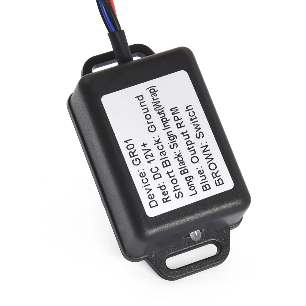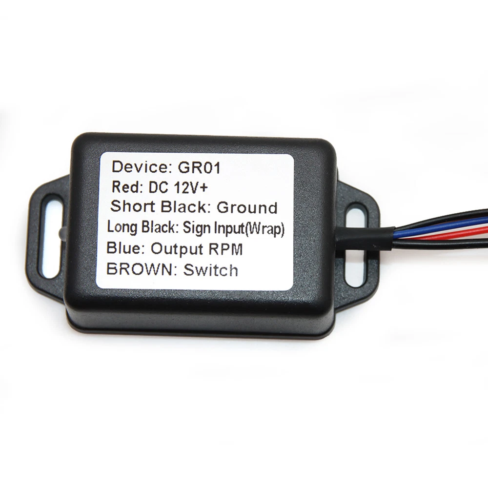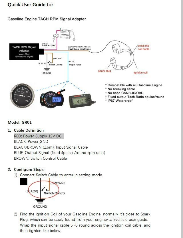 Model: GR01 1.Cable Definition RED: Power Supply 12V DC BLACK: Power GND BLACK/BROWN (1.6m): Input Signal Cable BLUE: Output Signal (fixed 4pulses/round rpm ratio) BROWN: Switch Control Cable 2.Configure Steps: 1)Connect Switch Cable to enter in setting mode 2)Find the Ignition Coil of your Gasoline Engine, normally it’s close to Spark Plug, which can be easily found from your engine/car/vehicle user guide. Wrap the input signal cable 5~8 round across the ignition coil cable, and then tighten like below: 3)Power on the Sensor, the LED will stay Green 4)Disconnect Switch Cable, the LED will still stay Green and calculate the detected pulse from engine 5)Connect Switch Brown Cable and Disconnect again, the LED will flash 6)The sensor output Pulse signal with fixed Tach RPM ratio 4pulese/round, which means it will output 66.6Hz when 1000RPM. For example, if the input frequency is 100Hz @1000RPM, the sensor will convert the signal and then output 66.6Hz @1000RPM 7)How to configure Tachometer? Please set your Tachometer/RPM Gauge tach RPM ratio to 4 pulses/round, then the Gauge will work properly. On Apr 7, 2025 at 06:50:56 PDT, seller added the following information: