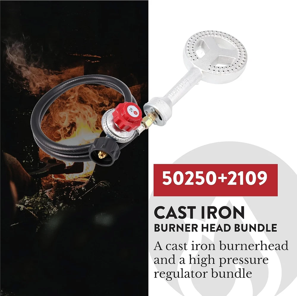 Special Feature: Manual Power Source: Propane Country of Origin: China Controls Type: Knob Brand: Does not apply Type: Does not apply Global Trade Identification Number: 00859176001140 Item model number: 50250+2109 Item Weight: 1.5 pounds UPC: 726084319059 Material: Cast Iron Burner type: Sealed gtin13: 726084319059 Is Discontinued By Manufacturer: No Included Components: Cast Iron Burner, Brass Fitting Orifice Product Dimensions: 5.5"D x 11.25"W x 2.5"H Color: Cast Iron Heating Elements: 1 Size: Burner Head + Regulator & Hose