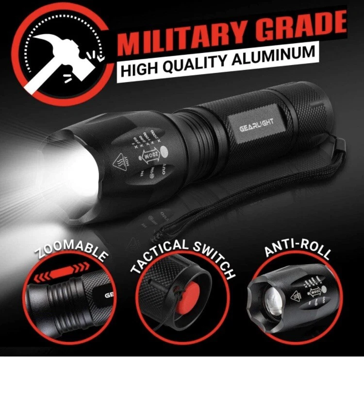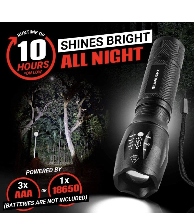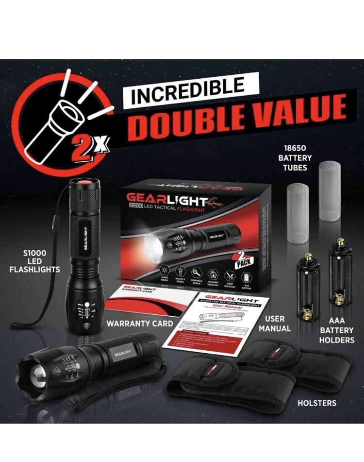 GearLight LED Tactical Flashlight S1000 [2 Pack] - High Lumen, Zoomable, 5. Modes, Water Resistant Light - Camping Accessories, Outdoor Gear, Emergency Flashlights About this item Ultra Bright & Long-lasting - Easily light up an entire room or focus in on objects up to 1000 feet away! 10 times brighter than old incandescent lights. Conveniently powered for hours with 3 AAA batteries or a single rechargeable battery. (Batteries are not included) Compact, Adjustable Focus, & Five Modes - 5 Useful Setting and wide-to-narrow beam zoom makes it ideal for use around the house, dog walking, or camping. It is compact enough to fit in your pocket, backpack, or purse allowing for easy storage and quick access. Water Resistant & Virtually Indestructible - Built for rough handling, this flashlight can survive a 10-foot drop or being temporarily submerged under water. You can even freeze it or run it over with a truck, and it will still work! Suitable for use in rain, snow, or emergency situations. Perfect for Any Situation - The Patent Pending S1000 delivers convenience and power that other flashlights simply do not offer. Featuring a run time of 10+ hours when used on the low setting, it is the ultimate camping accessories and gear. Exceptional Value, 2 Flashlights & 2 Cases - Keep one in your car, one in your home, or gift one to a friend or family member. Package Contents: 2x GearLight S1000 LED Tactical Flashlights, 2x AAA Battery Holders, 2x Battery Tubes, 2x Lanyards, 2x Holsters, 1x User Manual. (Batteries are not included)