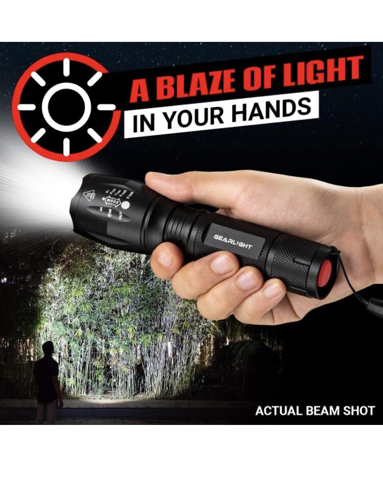 GearLight LED Tactical Flashlight S1000 [2 Pack] - High Lumen, Zoomable, 5. Modes, Water Resistant Light - Camping Accessories, Outdoor Gear, Emergency Flashlights About this item Ultra Bright & Long-lasting - Easily light up an entire room or focus in on objects up to 1000 feet away! 10 times brighter than old incandescent lights. Conveniently powered for hours with 3 AAA batteries or a single rechargeable battery. (Batteries are not included) Compact, Adjustable Focus, & Five Modes - 5 Useful Setting and wide-to-narrow beam zoom makes it ideal for use around the house, dog walking, or camping. It is compact enough to fit in your pocket, backpack, or purse allowing for easy storage and quick access. Water Resistant & Virtually Indestructible - Built for rough handling, this flashlight can survive a 10-foot drop or being temporarily submerged under water. You can even freeze it or run it over with a truck, and it will still work! Suitable for use in rain, snow, or emergency situations. Perfect for Any Situation - The Patent Pending S1000 delivers convenience and power that other flashlights simply do not offer. Featuring a run time of 10+ hours when used on the low setting, it is the ultimate camping accessories and gear. Exceptional Value, 2 Flashlights & 2 Cases - Keep one in your car, one in your home, or gift one to a friend or family member. Package Contents: 2x GearLight S1000 LED Tactical Flashlights, 2x AAA Battery Holders, 2x Battery Tubes, 2x Lanyards, 2x Holsters, 1x User Manual. (Batteries are not included)
