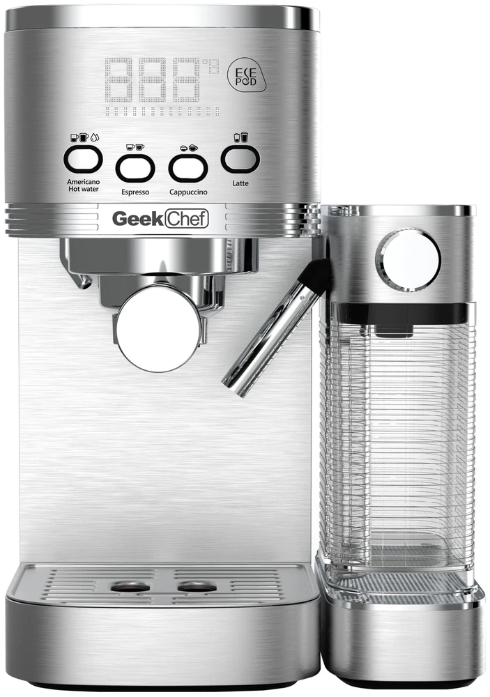 ☕All Your Favorite Coffees in One Machine - Geek Chef's coffee maker with automatic milk frother lets you brew americano, latte, cappuccino, or macchiato at home.Not only suitable for personal use, but also a perfect gift for others, such as wedding gifts, birthday gifts, Christmas gifts, Thanksgiving gifts, New Year gifts, and more. ☕Discover the Convenience of Our Automatic Milk Frother - The Automatic Milk Frother is all about quick and easy frothing for a perfect latte or cappuccino wherever you are. With one-touch operation, it's simple and convenient,ensuring you can enjoy a high-quality frothy beverage in no time.Customize your coffee by pressing the control panel. ☕20-Bar Pressure System & Temperature Display - The high pressure ensures that the water interacts optimally with the coffee grounds, resulting in a more robust and aromatic cup of coffee. The real-time temperature display ensures your coffee is brewed at the ideal temperature, enhancing flavor and taste to perfection. ☕ESE Pod Filters, Single, and Double Filter Options - The Single Shot Filter gives a concentrated flavor, the Double Shot Filter offers a bolder brew, and the ESE Pod Filter provides quick, mess-free convenience. Whether you prefer a solo espresso or a robust double shot, these filters have you covered. ☕Compact & Stainless Steel Design: Our coffee machine combines a space-saving build with a sleek stainless steel exterior, making it an ideal addition to any kitchen. The compact design ensures versatility for both home and office use.Stainless steel is easy to clean, durability resistance to wear,and an attractive,sleek appearance. ☕Important Notice: Please carefully read the user manual before use. If you have any questions, feel free to contact us. Purchase with confidence, as we offer a 1-year warranty period.