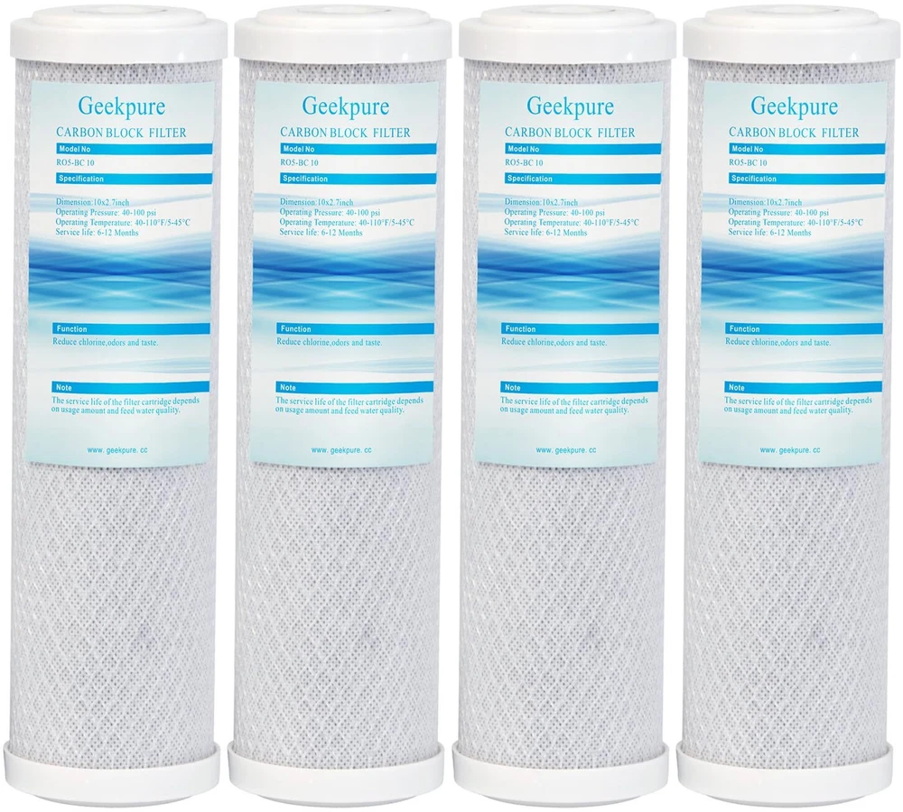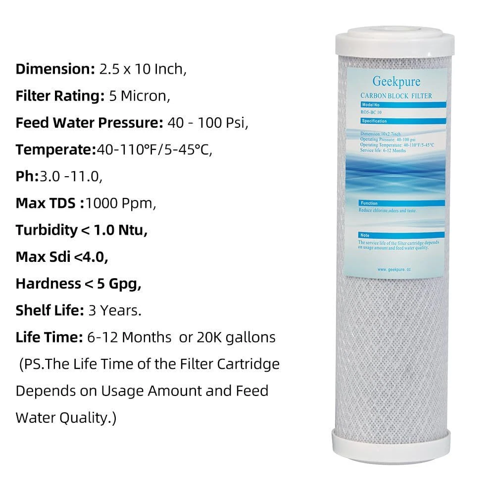 Coconut Shell Carbon Block Water Filter Cartridge 10"x2.5".Micron rating: 5 Micron Fits standard 2 1/2 by10-Inch in line filter housings,as prefilter of Reverse Osmosis System Water Filtration Carbon block filter is used to reduce chlorine, taste & odors, very fine particulates.Flow rate: 2.5-5 GPM (It depend on the feed water pressure and quality.) LIFE TIME:6-12 months.The Life Time of the Filter Cartridge Depends on Usage Amount and Feed Water Quality Work Pressure: 10-70 psi ,Work Temperature:40-110°F/5-45°C , Shelf life: 3 Years ISO9001:2015 certificated Manufacturer Pack of 4 filters in the box
