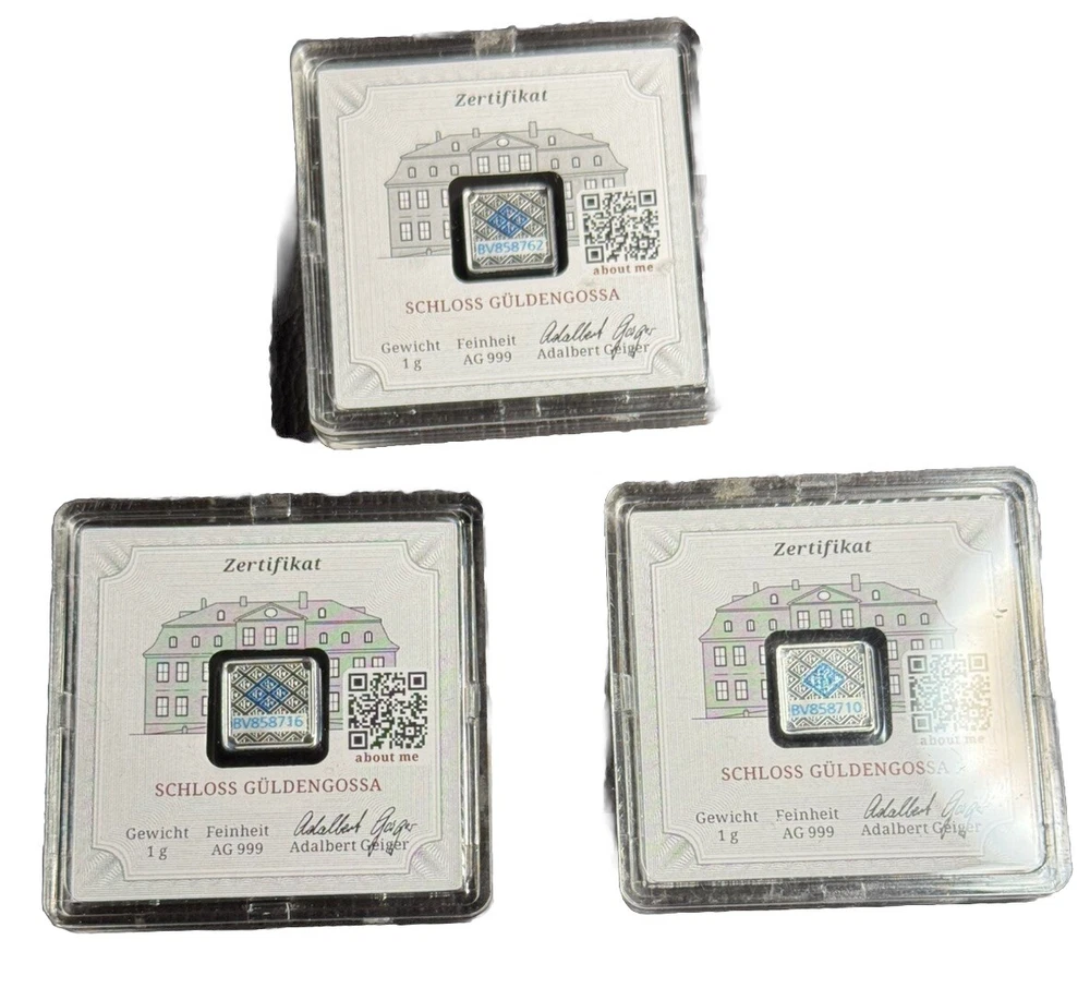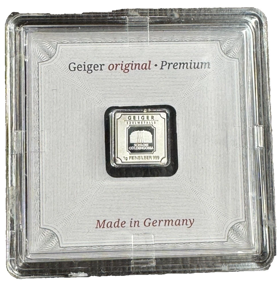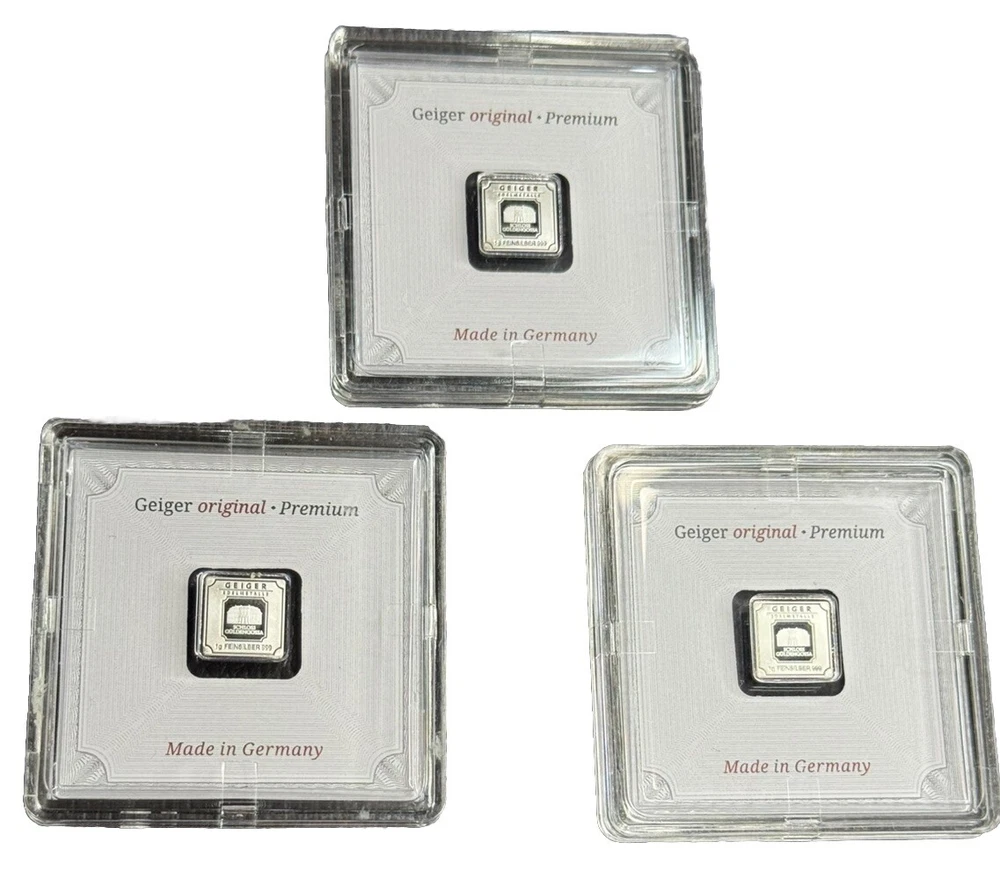 Add this lot of 3 Geiger silver square bars to your collection today! Each bar contains 1 gram of .999 fine silver, making them a high-quality addition to any investment portfolio. These bars are in excellent condition, sealed and untouched for your convenience. Originating from Germany, these bars are a great choice for any collector or investor looking for a reliable and valuable asset. They are perfect for those who want to invest in precious metals without having to worry about the condition of their items. With a business strike type and ungraded grade, these Geiger silver square bars are a great choice for anyone looking to add to their collection.