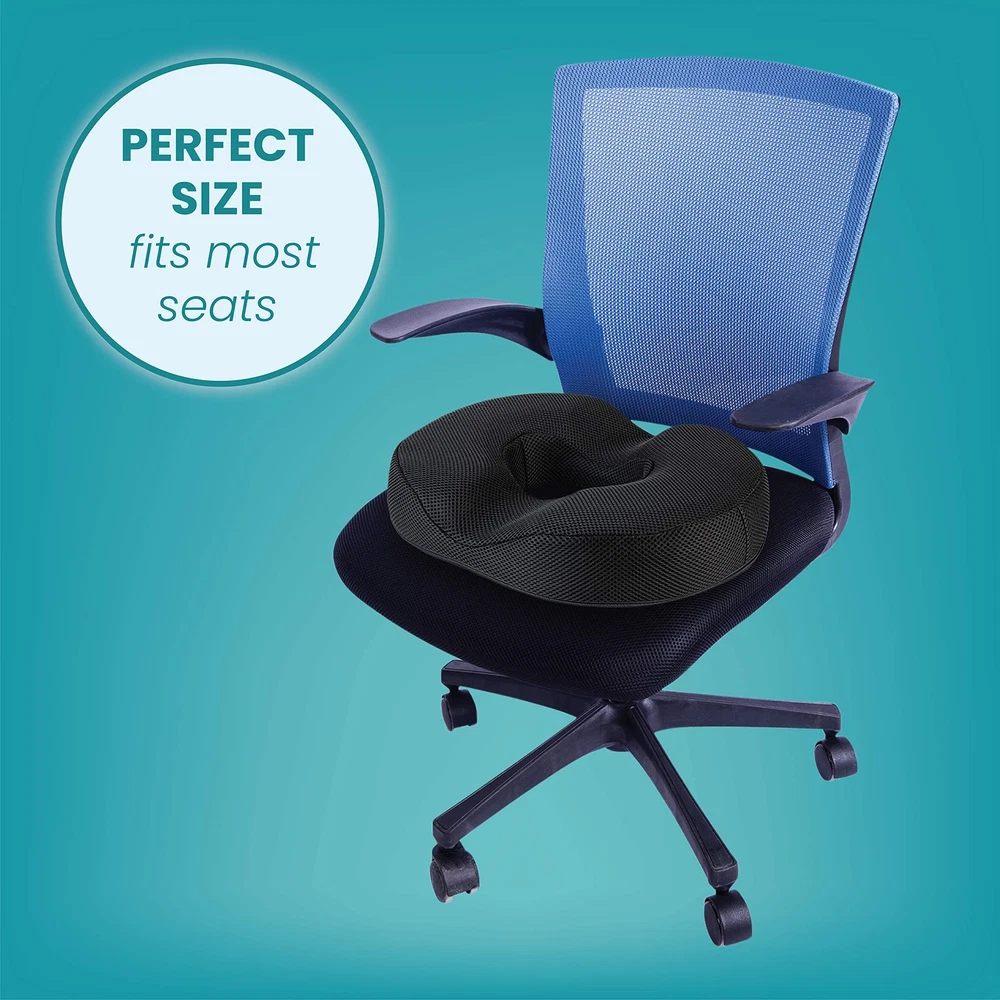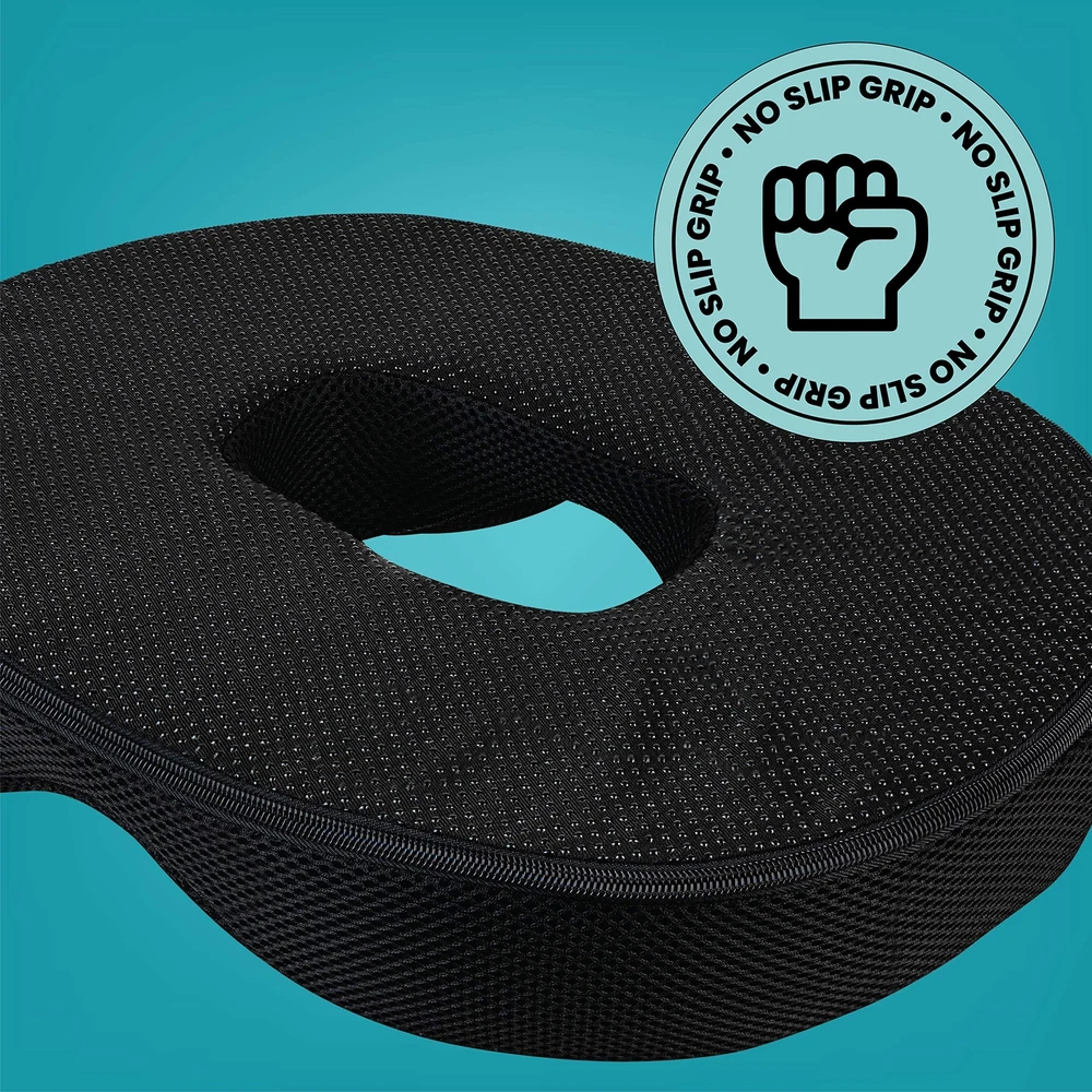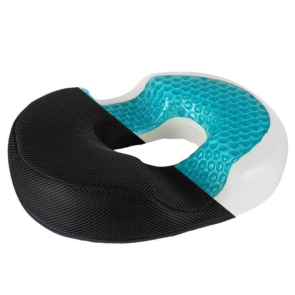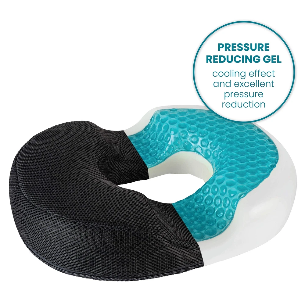 The Gel Donut Cushion is ergonomically designed to reduce pressure on the tailbone and coccyx while offering proper support and a comfortable seating surface. Top layer of cushion contains pressure reducing gel for supreme comfort. Use in your car, office, home or anywhere for comfortable seating. Perfect hemorrhoid pillow. Ideal for back pain, post surgery, pregnancy, prostate treatment, and butt pillow after surgery. Sciatica cushion. It's Got To Gel - The Gel Makes All The Difference - The object of a donut seat cushion is pressure relief. That's why the Donut Cushion contains a top layer of pressure reducing gel. Coccyx cushion. Preganacy pillow. Tailbone pain relief cushion - Lower back pain, sciatica, post surgery, and pregnancy, pain can make sitting for long periods of time a nightmare. The Donut cushion features strategic cut outs to reduce pressure on the coccyx and tailbone. Cool Cushion - The gel helps keep the cushion cool. Ventilated Mesh Cover offers a comfortable and cool seating surface. A non-slip bottom ensures the cushion stays firmly in place. Cover is removable and washable. Lifting Cushion. Give yourself a lift. Provides relief while allowing you to rise with ease. Portable and easy to use - Use the donut cushion in your car, office, wheelchair, home or anywhere for comfortable seating. Butt pillow after surgery. The specially designed gel of the donut cushion is supported by premium medical foam, allowing for deep immersion and supreme comfort.