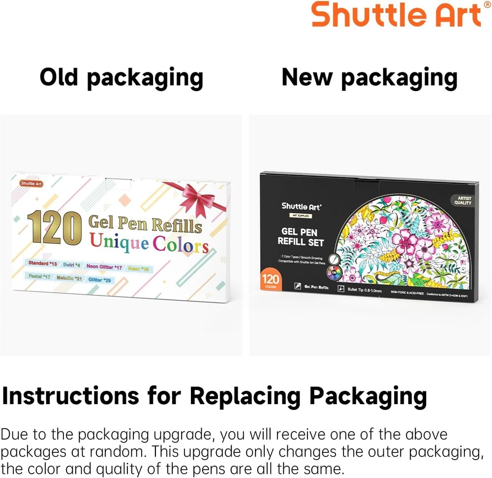 Gel Pen Refills, Shuttle Art 120 Colors (No 120 Count (Pack of 1), 120 Product Details Manufacturer: Shuttle Art Brand: Shuttle Art Item Weight: 7 ounces Package Dimensions: 10.67 x 5.75 x 0.63 inches Item model number: SAGP-120R Color: 120 Colors Closure: Snap Material Type: gel Number of Items: 120 Size: 120 Count (Pack of 1) Point Type: Fine Ink Color: Pastel Manufacturer Part Number: SAGP-120R Brand: Shuttle Art Ink Color: Pastel Style: Ballpoint Point Type: Fine Number of Pieces: 120 120 UNIQUE COLORS: Shuttle Art Gel Pen Refills Set has 120 unique colors, including 7 color types: glitter, neon glitter, metallic, neon, pastel, swirl, standard. Abundant colors with varied color types, fully meet your demands of coloring, writing and drawing. SMOOTH WRITING: Without skipping or bleeding, 0.8mm-1.0mm ballpoint tip can produce smooth and no skipping fine lines for coloring. And different color types are individually packaged, which makes it easier to find what you need. VARIETY OF USES: Great for bullet journaling, sketching, drawing, writing, coloring books and any other designs on Scrapbooks, School Projects, Party Invites, Greeting Cards, DIY Decor & Letters to Friends & Family. QUALITY GEL PEN REFILLS: The coloring gel pen refill set is non-toxic and acid-free. Conforms to ASTM-D4236. Definitely an ideal art supply for adults and kids. With those refills, there is no need to buy single pen. Less cost, more happiness.
