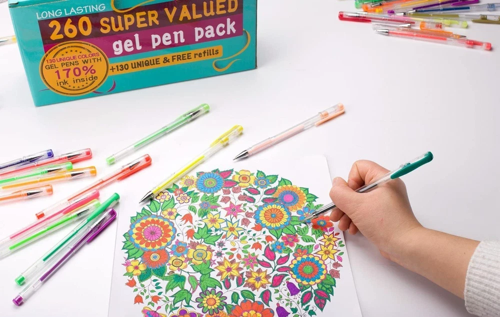 260 super valued feela gel pens pack includes 130 unique gel pen and 130 refills. Color assortment: Glitter, Neon Glitter, Neon, Metallic, Pastel, Swirl, and Standard. Suit for children and adult, great for coloring, doodling, drawing and sketching. With Color box packing, eco friendly and delicate. Tip size: 0.6-1.0mm. Super smooth writing and long lasting. Acid-free and non-toxic, conforms to ASTM D-4236. Performance&Satisfaction: We provide you with not only our high quality products but also our quick response service. Product Description