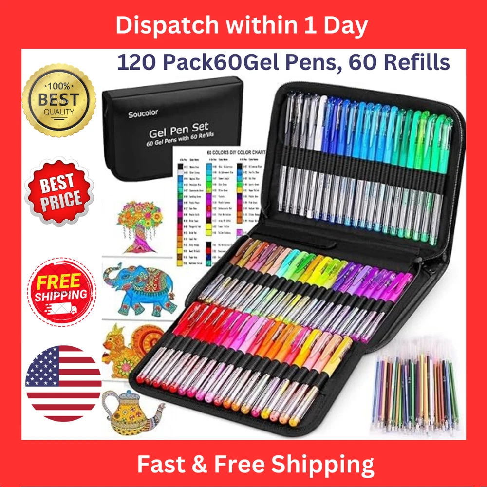 Free eBay listing template designed by dewiso.com Soucolor 120-Piece Gel Pen Set with Travel Case – Vibrant Multicolor Gel Pens for Coloring, Drawing & Journaling The Soucolor 120-Piece Gel Pen Set is a comprehensive and colorful collection designed for artists, students, and craft enthusiasts . Featuring 60 vibrant gel pens with 60 matching refills , this set includes a variety of metallic, glitter, pastel, neon, rainbow, and classic colors to bring your creativity to life. The portable zippered case with elastic loops ensures easy organization and travel convenience , making it perfect for on-the-go creativity . Key Features: 🖊 120-Piece Gel Pen Set with Bonus Accessories 60 Unique Gel Pens in various styles: 17 Metallic 10 Glitter 11 Pastel 12 Neon 6 Rainbow 4 Classic 60 Matching Color Refills for extended use. Includes 4 coloring sheets (8 pages total) and 1 blank DIY color card . 🌈 Smooth, Precise & Vibrant Writing 0.8mm-1mm ballpoint tip for smooth, controlled ink flow. Fast-drying, smudge-free ink —no skipping or smearing. Comfortable grip for effortless writing and drawing. 🎨 Quick & Easy Color Selection Each pen is labeled with a color name and code for fast identification. Blank DIY color card allows for easy organization and reference. 🎒 Portable Zipper Case for Storage & Travel Durable black PU case with elastic loops for each pen. Compact & travel-friendly —take your gel pens anywhere! ✅ Safe & Non-Toxic Conforms to safety standards —safe for kids, teens, and adults. Ideal for coloring books, scrapbooking, journaling, DIY crafts, greeting cards, school projects, and more ! 🎁 Perfect Gift for Artists & Crafters Great for students, teachers, kids, and hobbyists . A wonderful gift for birthdays, holidays, and special occasions . Unlock endless creative possibilities with the Soucolor 120-Piece Gel Pen Set —the perfect tool for coloring, drawing, writing, and crafting ! ✨ Contact us We are readily available to assist you with any inquiries, comments, or product requests via eBay messages. Our team is committed to responding within 24 hours and providing the utmost support. We strongly encourage our valued customers to reach out to us for any questions or concerns, ensuring your complete satisfaction with your purchase. Payment Shop with confidence on eBay knowing that your payment is secure. We utilize advanced security measures to protect your personal and financial information. Rest assured that your transaction is encrypted and handled with utmost confidentiality. For any concerns, our dedicated customer support team is available to assist you promptly. Your security is our priority. Shipping At eBay, we prioritize the secure shipping of your orders. Our trusted shipping partners ensure the safe and timely delivery of your purchases. Rest assured that your package is handled with care and tracked every step of the way. Should you have any questions or concerns, our customer support team is here to assist you promptly. Shop confidently knowing your shipping is in good hands. Disclaimer We prioritize customer security and offer a hassle-free return process. Our policy ensures your satisfaction and a secure return experience. Review our guidelines on the product listing or contact us for assistance. We promptly address concerns, ensuring your confidence in shopping with us. Your satisfaction is our commitment.